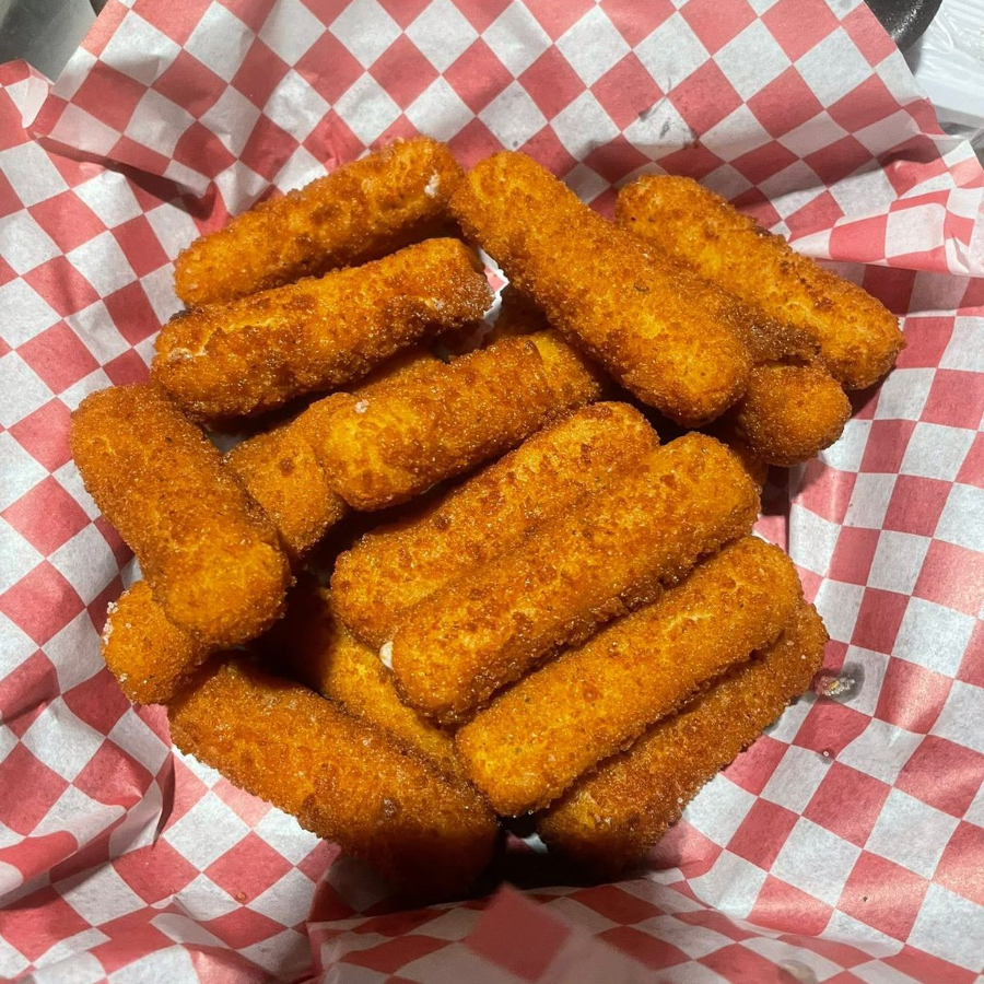Catorce piezas de palitos de queso mozzarella fundido, empanizados y fritos a la perfección.