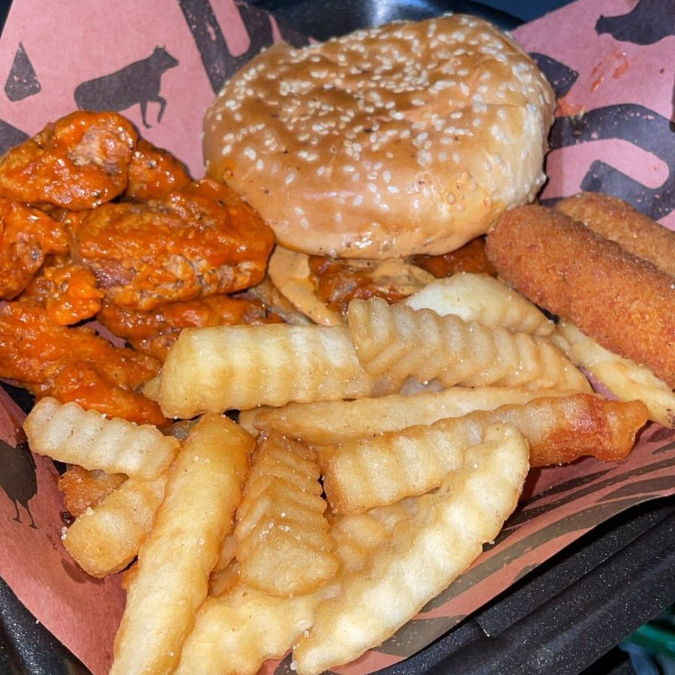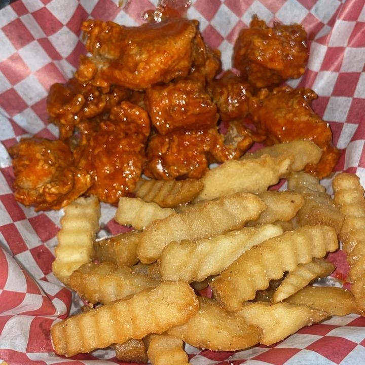 Combo ganador de crujientes trozos de pechuga de pollo empanizados acompañados de una porción de papas fritas.