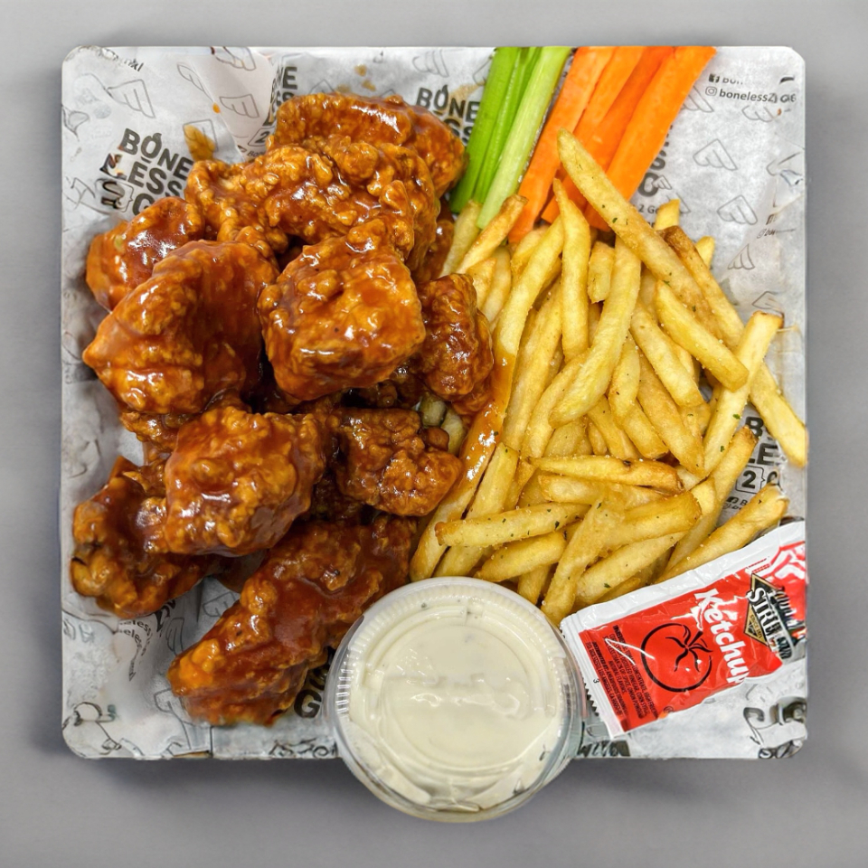 12 piezas de deliciosos Boneless, acompañados de papas y verdura
