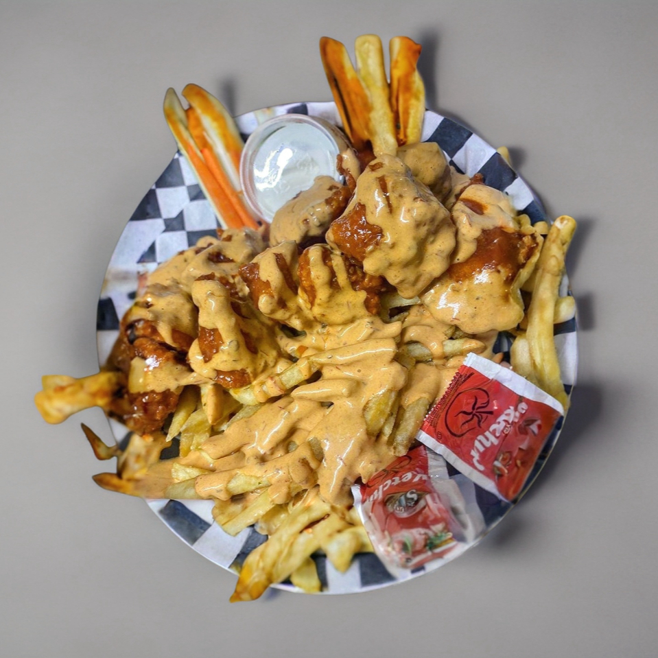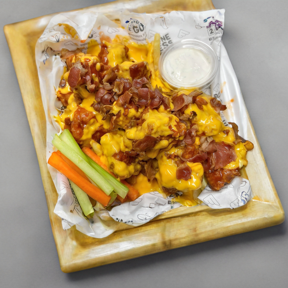 Papas con 10 piezas de Boneless, tocino y queso, bañados en Chipotle