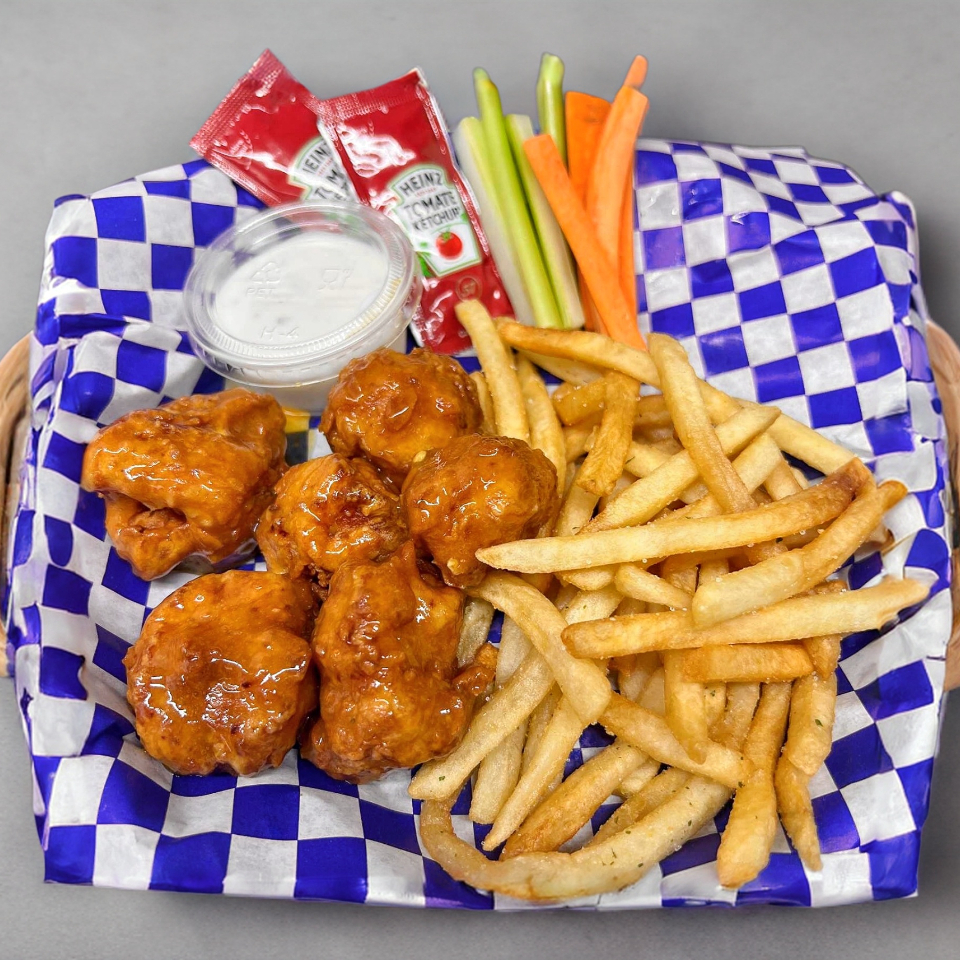 8 piezas de deliciosos Boneless, salsas a elegir, acompañados de papas francesa ( 150 gramos aprox) y verdura