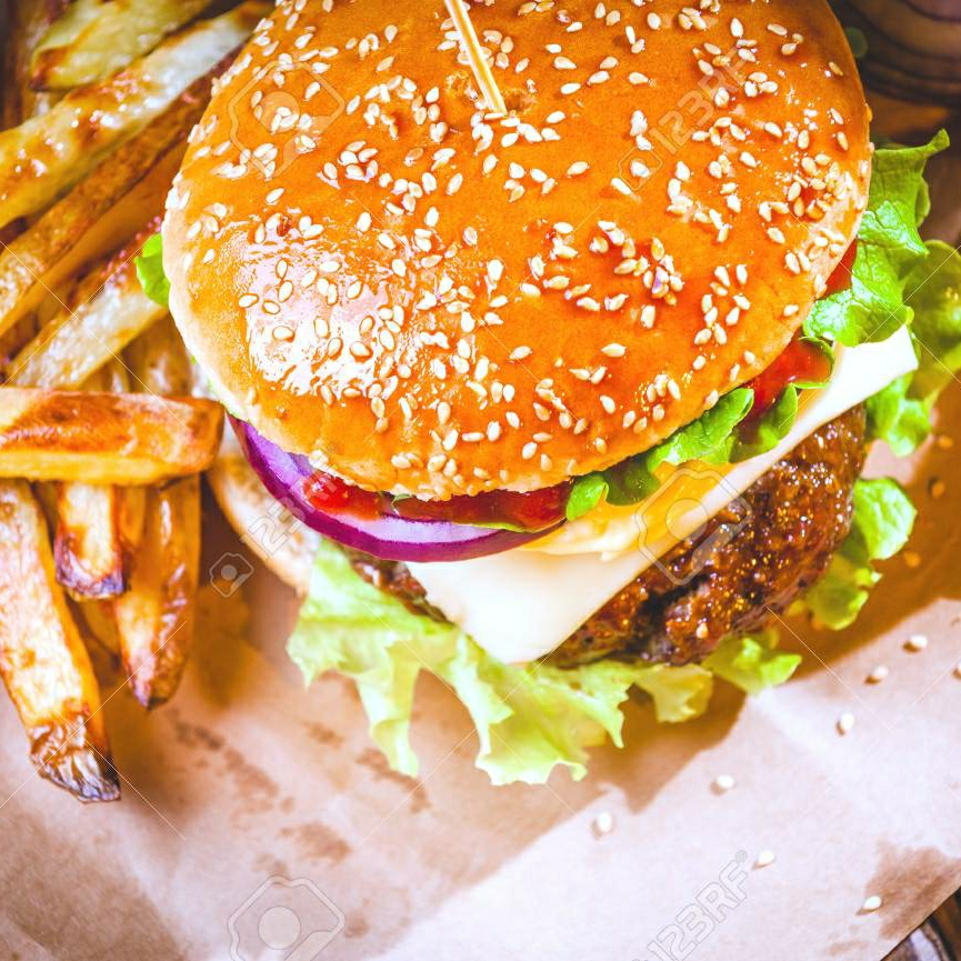 pan de bimbo , carne de res tomate cebolla y queso amarillo + papas fritas
