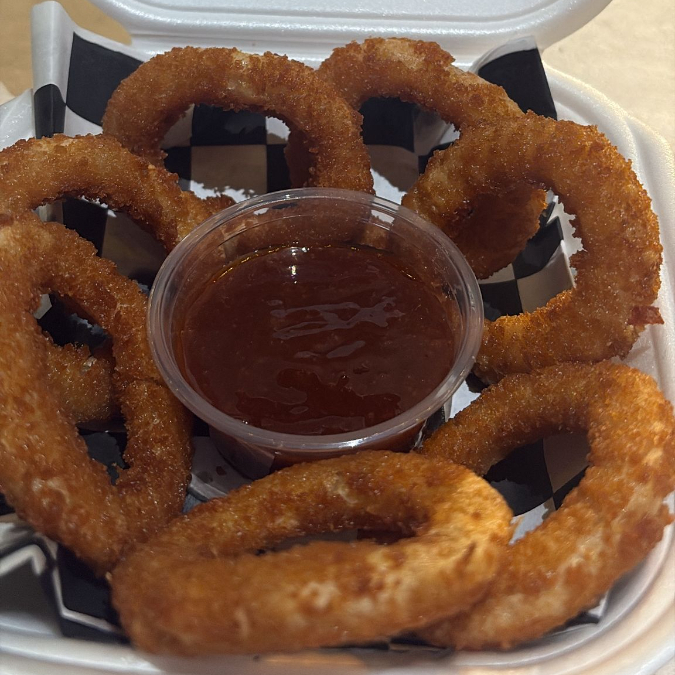 7 aros de cebolla empanizados con su porcion 2oz de aderezo bbq