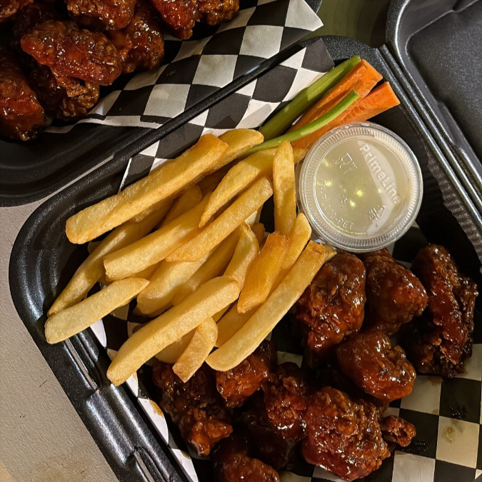 10 Piezas de boneless bañadas en la salsa de su elección, acompañadas de papas fritas y aderezo ranch.