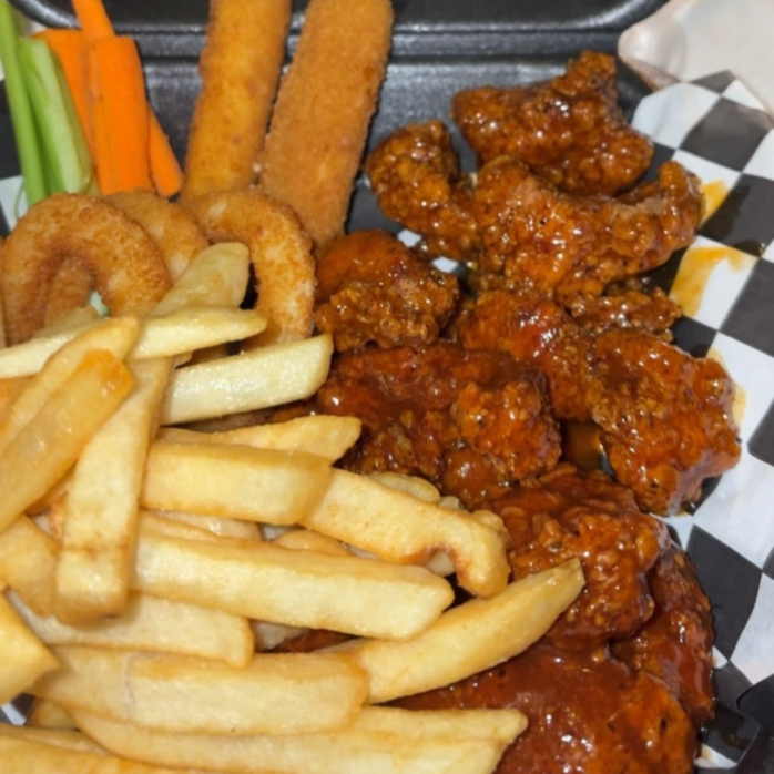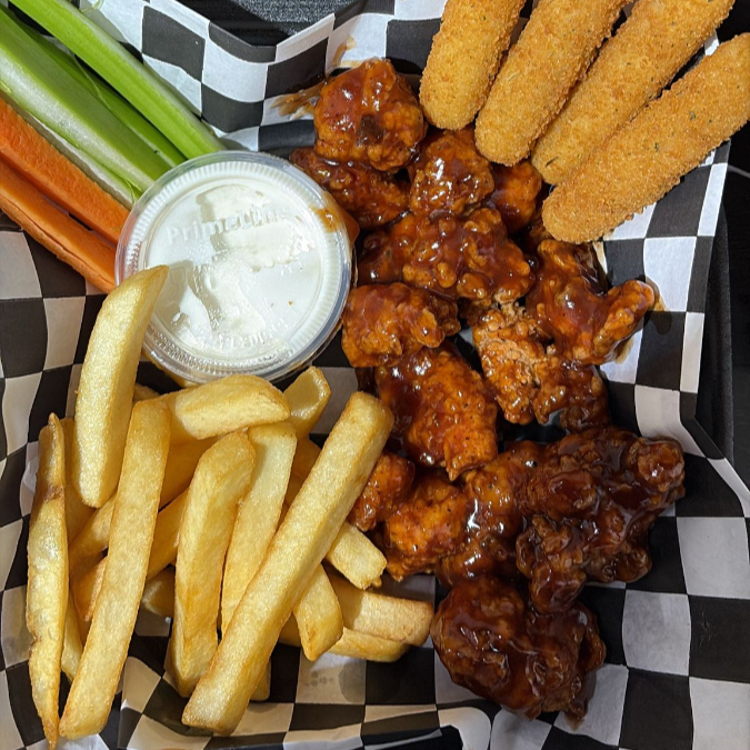Combinación completa que incluye 10 piezas de boneless, papas fritas, 2 dedos de queso y 3 aros de cebolla, servidos con aderezo ranch.