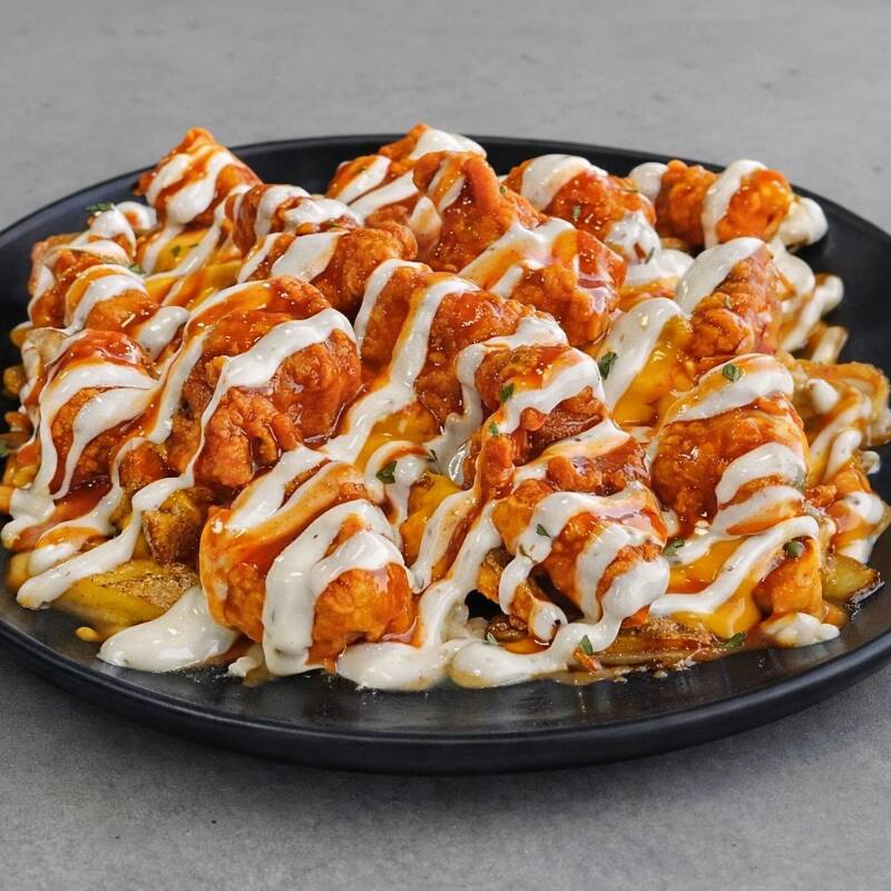 Papas fritas, tocino, queso mozarella, queso de nacho, bañadas en salsa bufalo y ranch