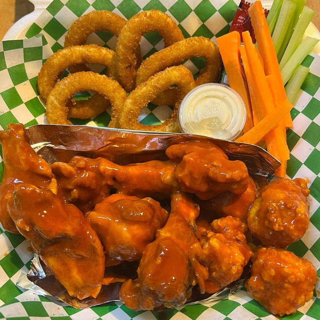 Orden de Boneless bien servida. A elegir papas sazonadas en gajos o aros de cebolla, apio, zanahoria y aderezos.