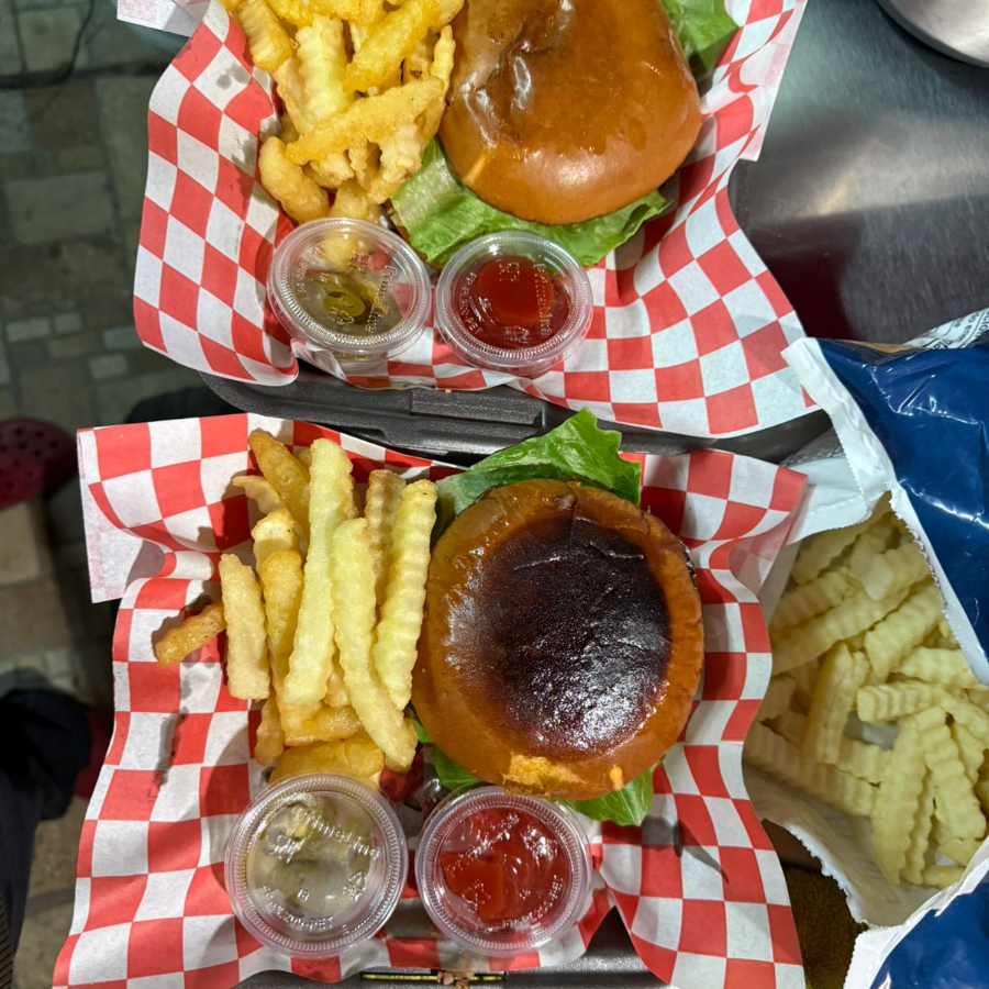 dos hamburguesas, media orden de boneles, acompañados de papas y aderezos