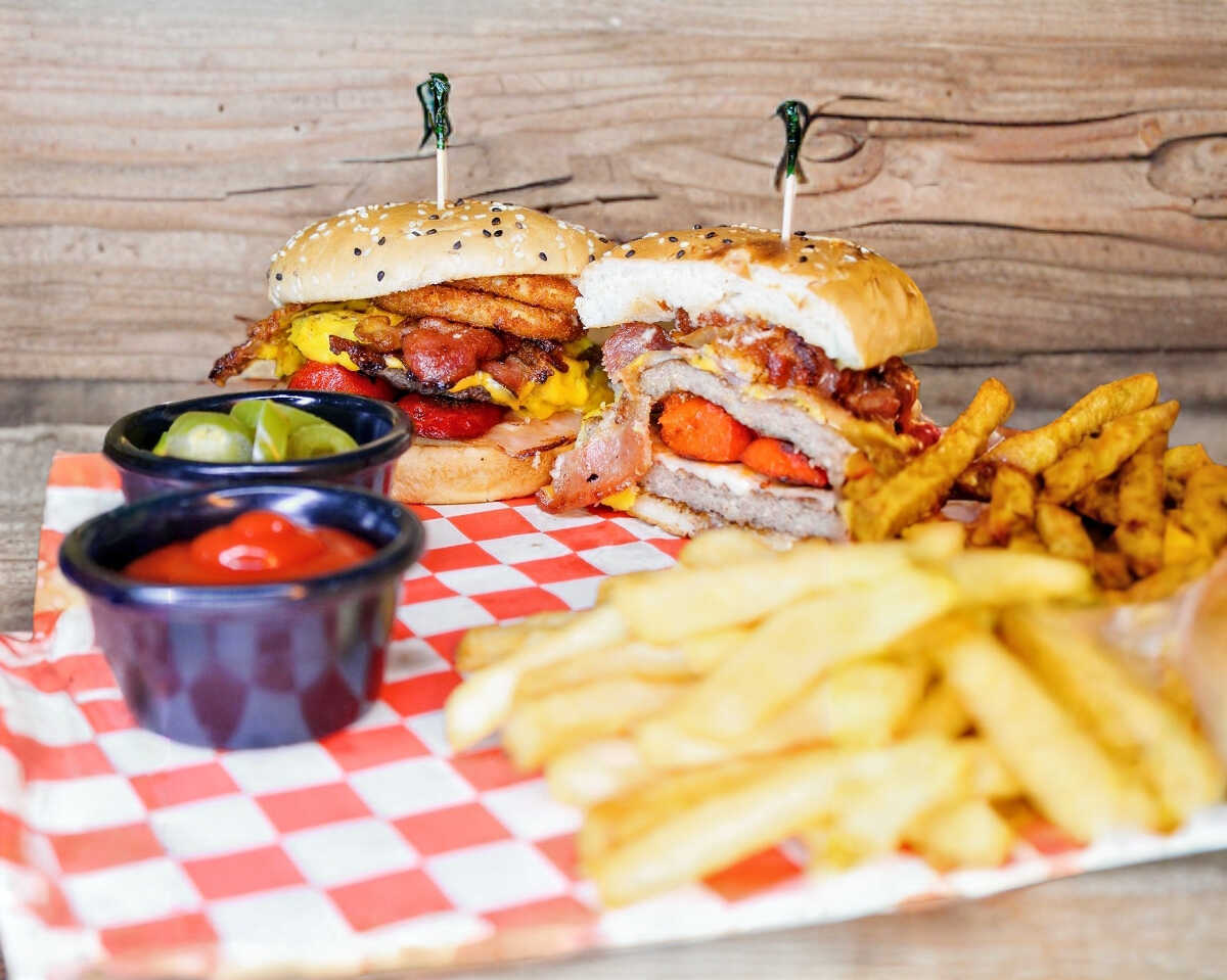 Dos carnes 100 % de res, queso amarillo, queso blanco, tocino, jamón, bubas, aros de cebolla y aderezo de la casa.