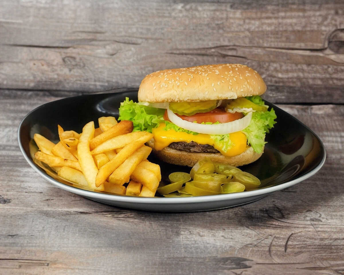Carne 100 % de res, queso amarillo, lechuga, tomate, cebolla.