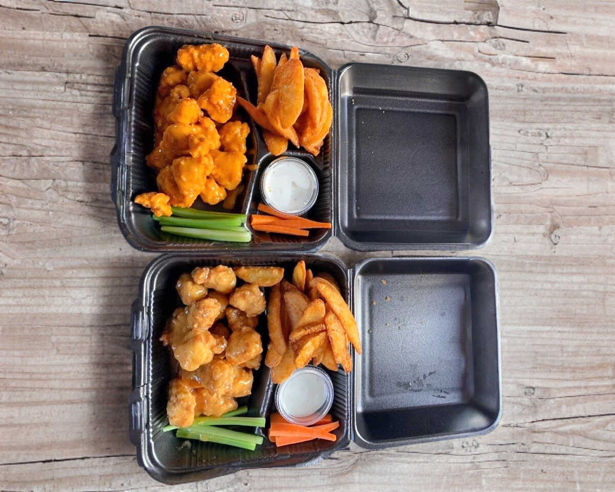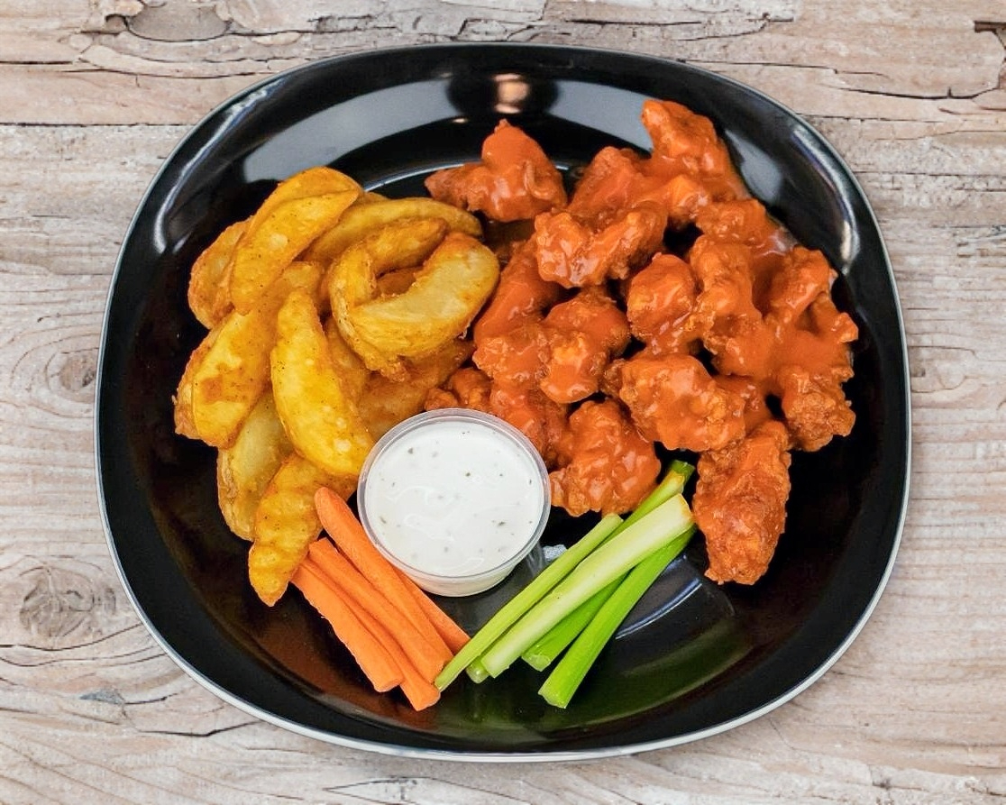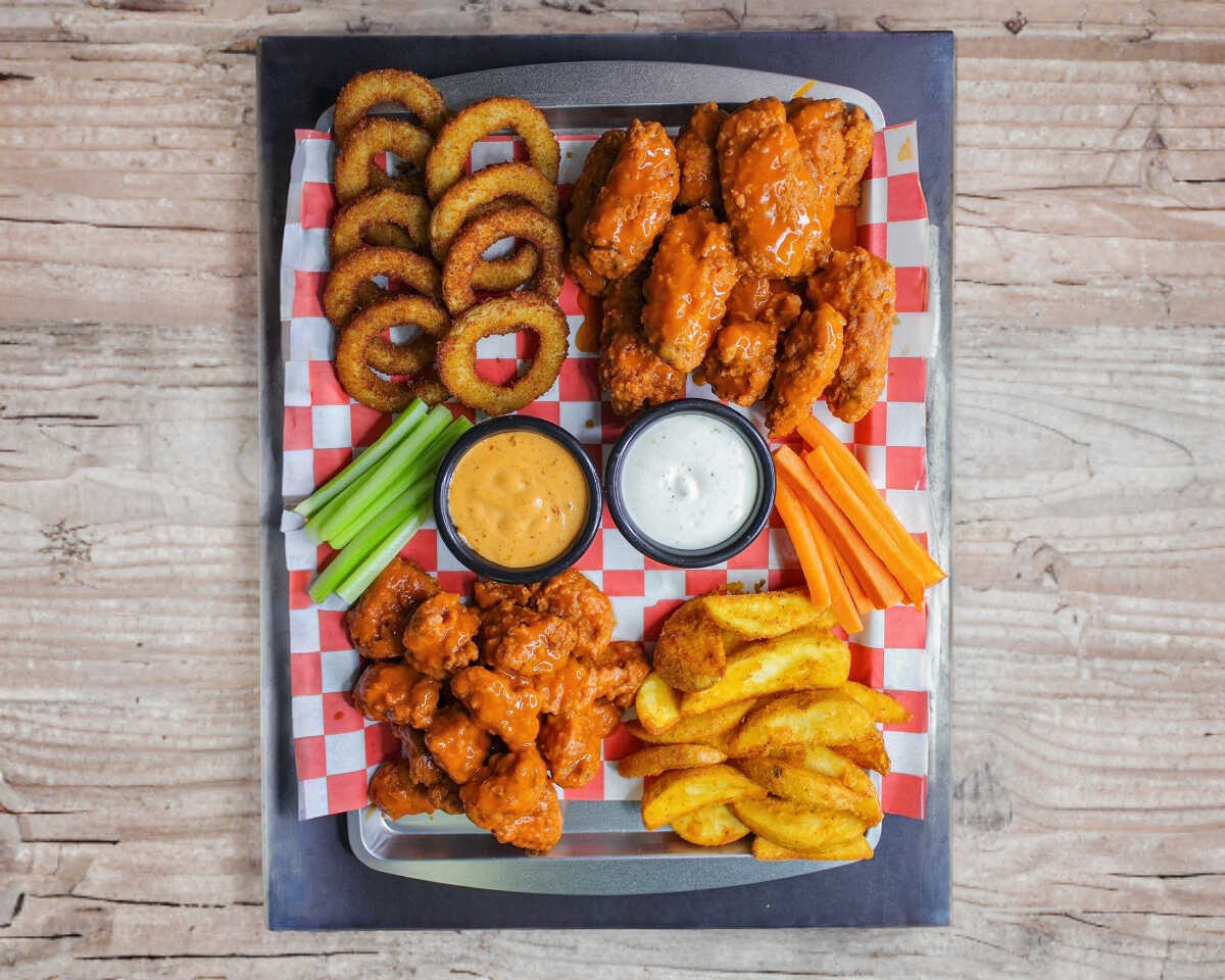250 g De boneless, 10 piezas de alitas, papas sazonadas o francesas, 10 aros de cebolla, apio, zanahoria y aderezos.