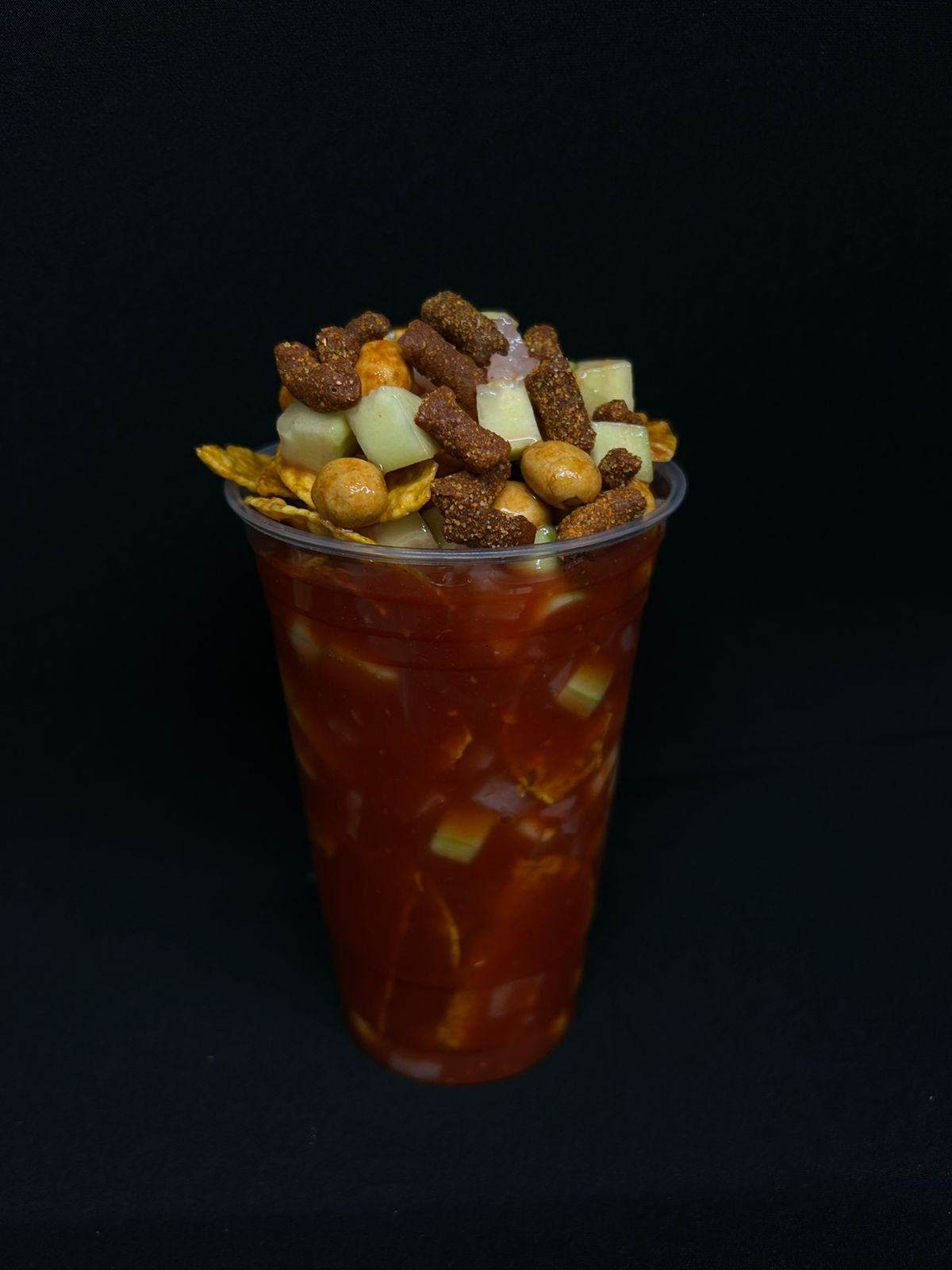 1 Paquete de Tostitos o papitas a elegir, cueritos, pepinos, cacahuates, chacachaca, sal, limón, chamoy y clamato.