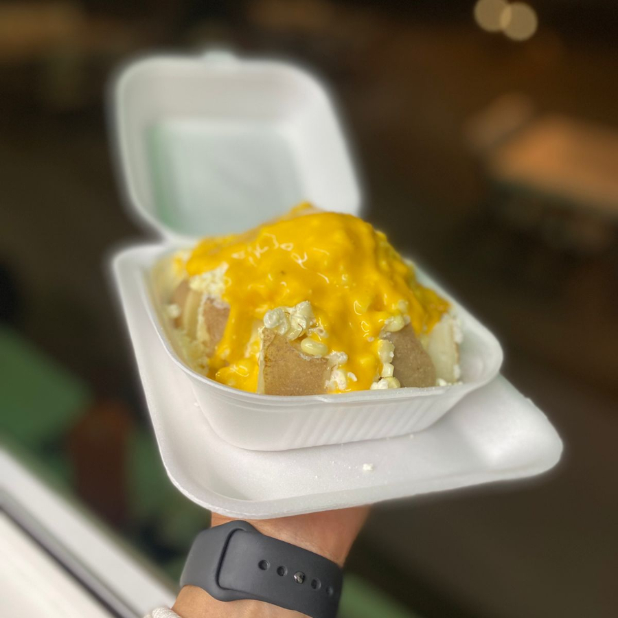 Incluye 1 papa 🥔 cocida,con queso Monterrey,coctel de elote mantequilla mayonesa queso cotija queso de nachos