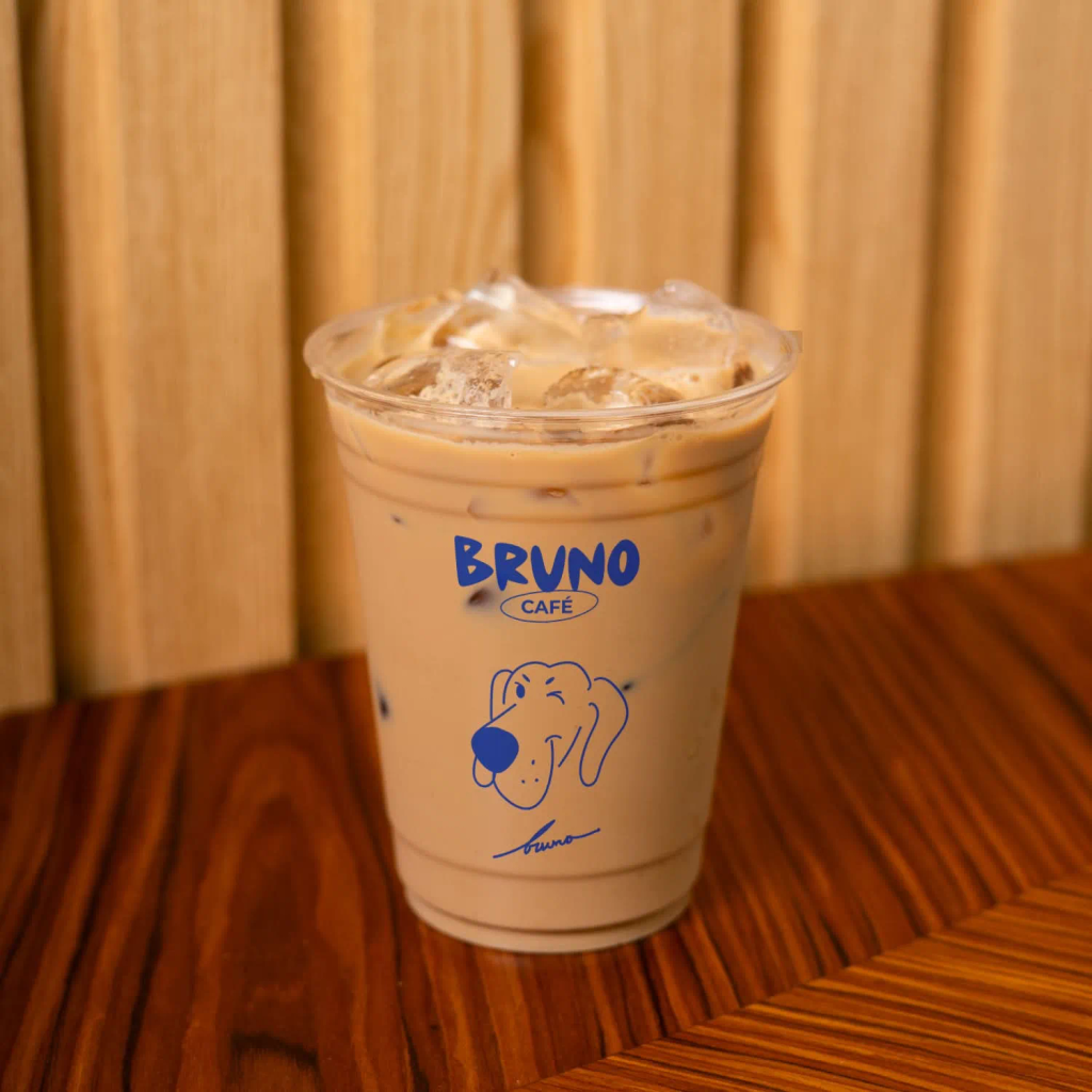 Base espresso doble con leche, esencia de caramelo y hielo en vaso de 16 oz.