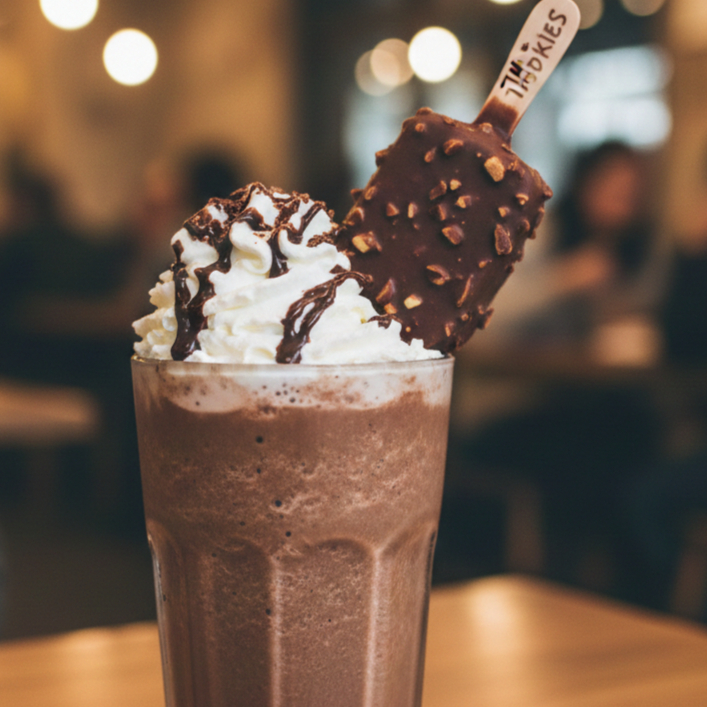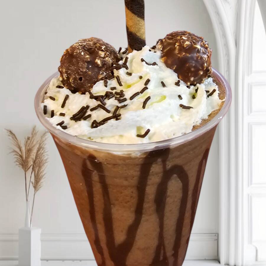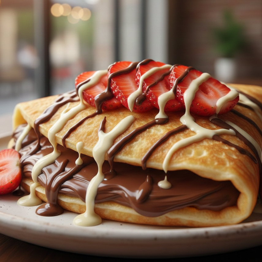 Crepa rellena de Nutella decorada con fresas bañada en chocolate líquido Hersey's y lechera.