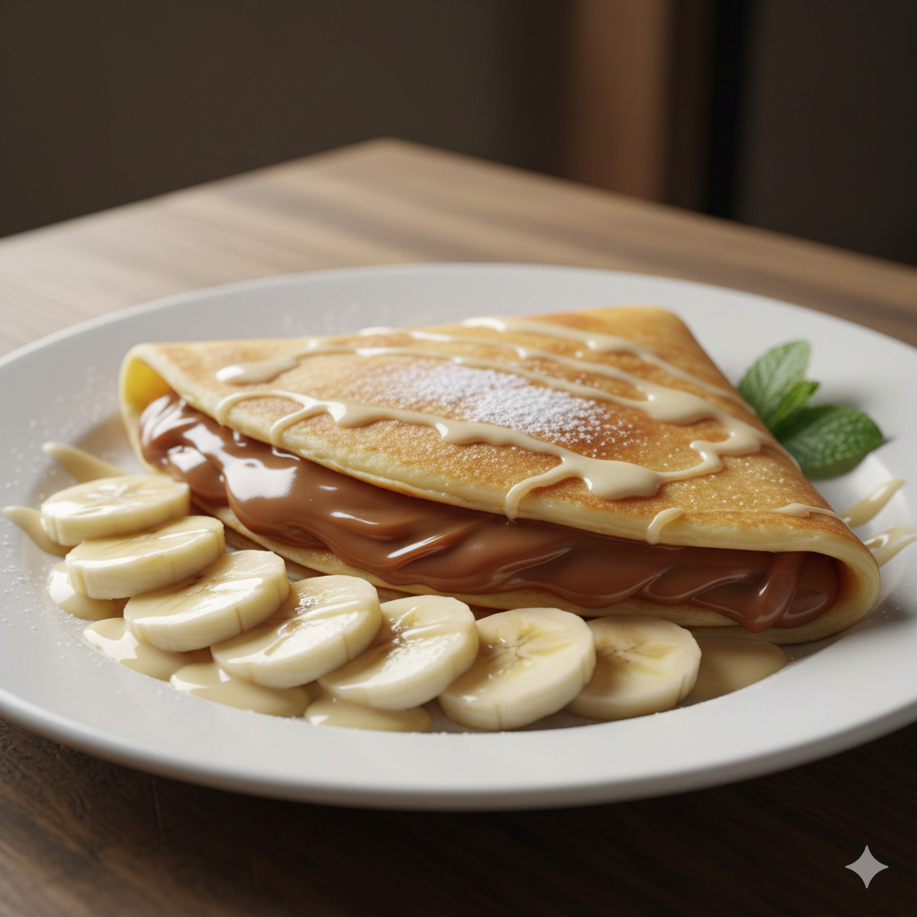 Crepa rellena de cajeta y decorada con plátano y lechera.