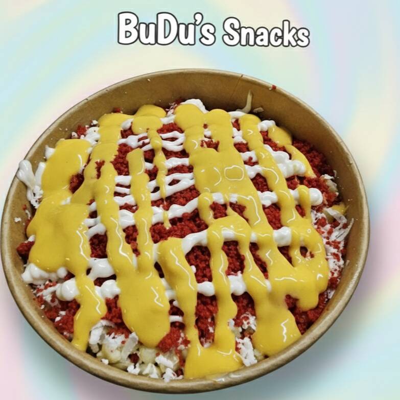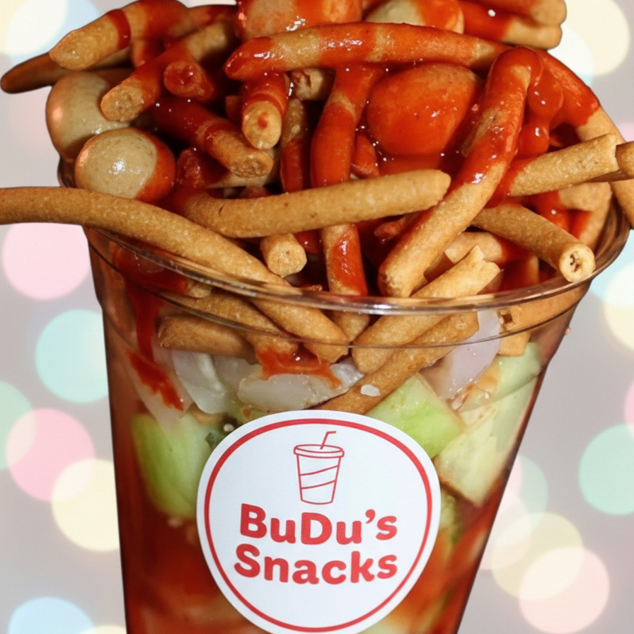 Churros locos con clamato, pepino, cueritos, cacahuates, chaka chaka, rollito (serpentina) tarugo, saladito, salsa del amor, chamoy, chile en polvo y limón.