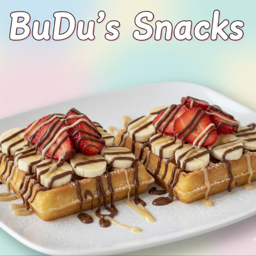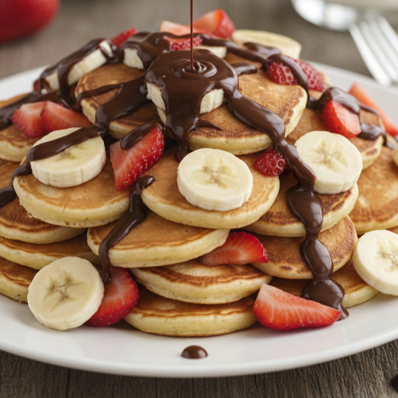 4 Mini Waffles con Plátano, Fresas, Nutella, Lechera y Chocolate Líquido Hersey's