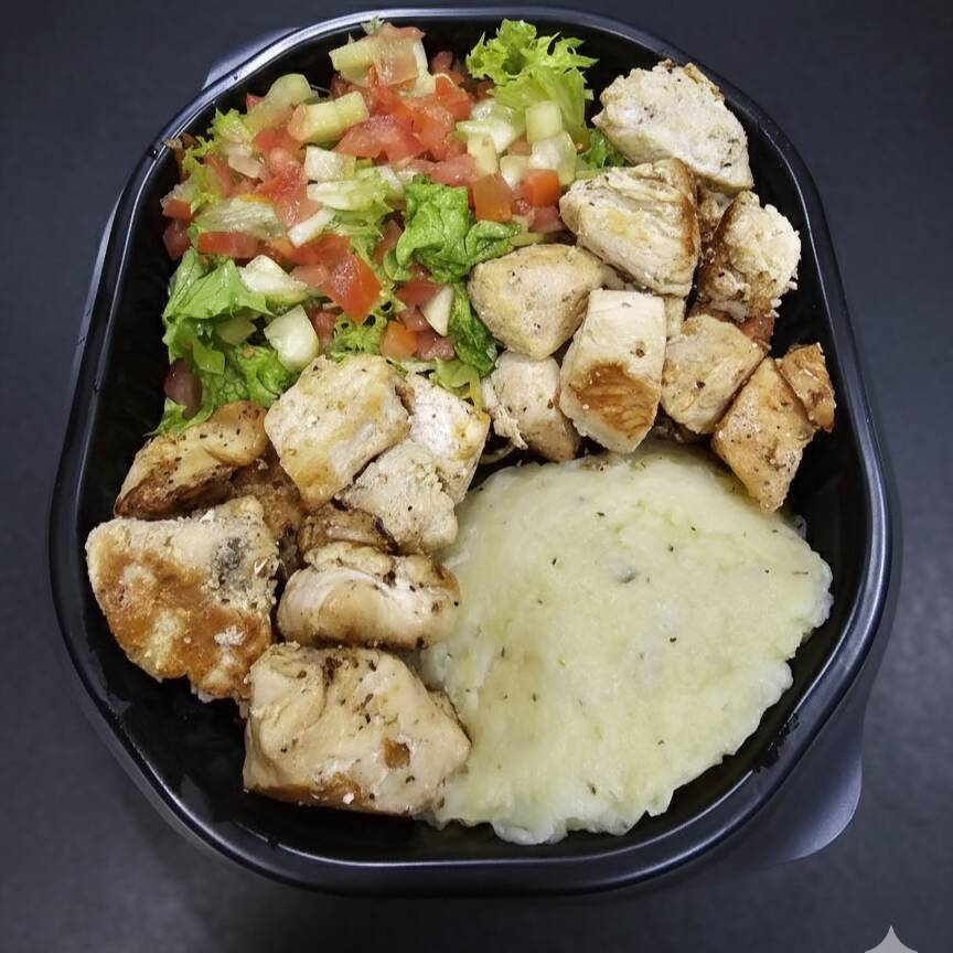 Deliciosa pechuga a la plancha acompañada de puré de papa, y ensalada de pepino, tomate y lechuga.