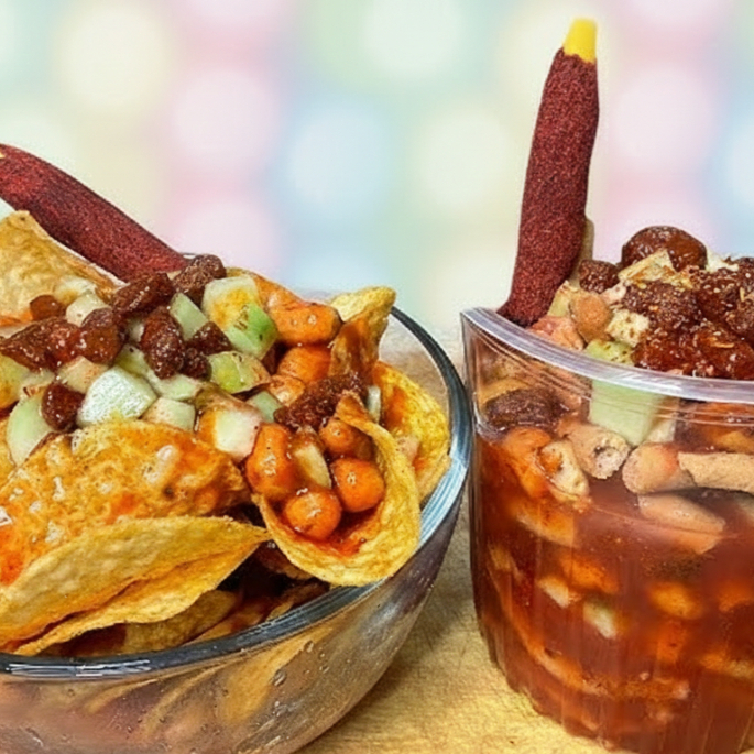 Cacahuates locos tostitos locos con clamato, pepino, cueritos, cacahuates, chaka chaka, rollito (serpentina) tarugo, saladito, salsa del amor, chamoy, chile en polvo y limón.