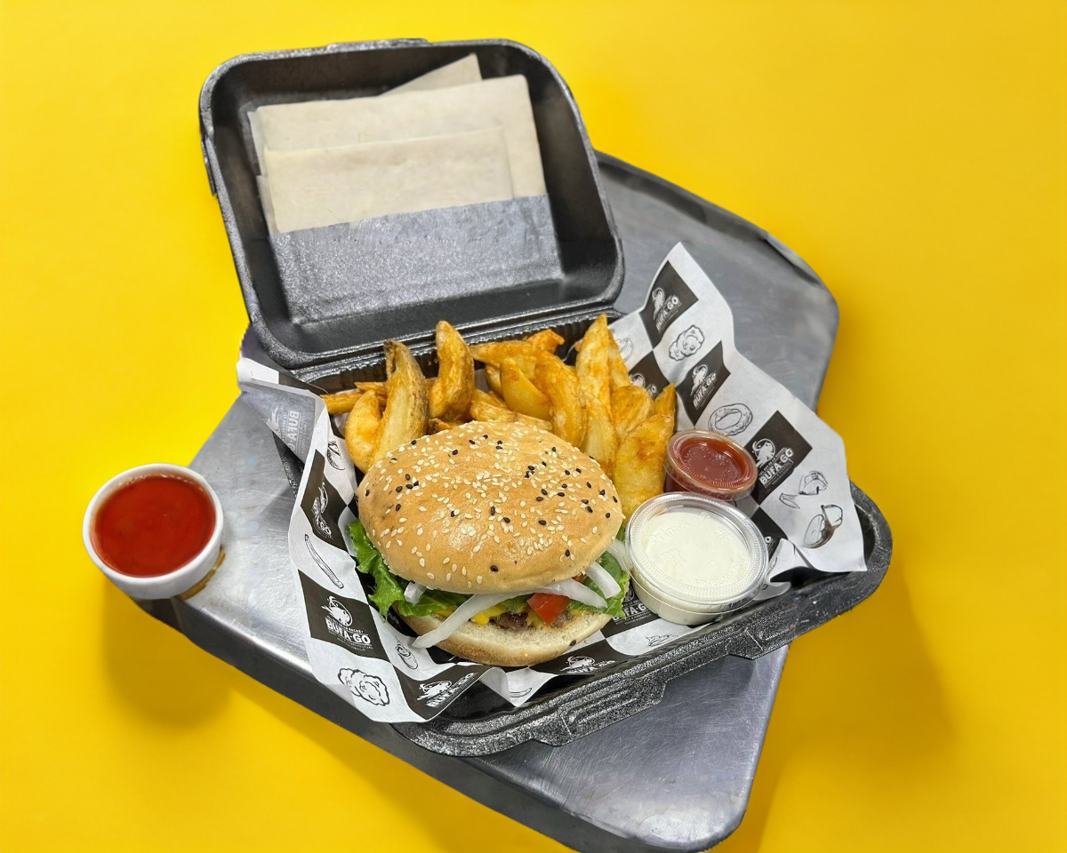 hamburguesa de carne de res, queso amarillo, tomate cebolla, pepinillos acompañado de papas.