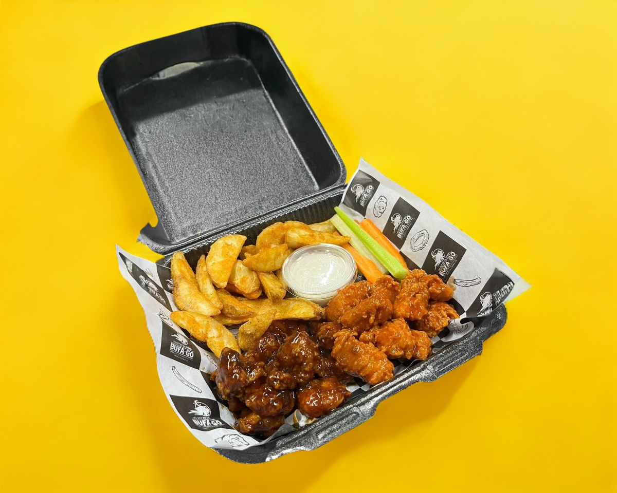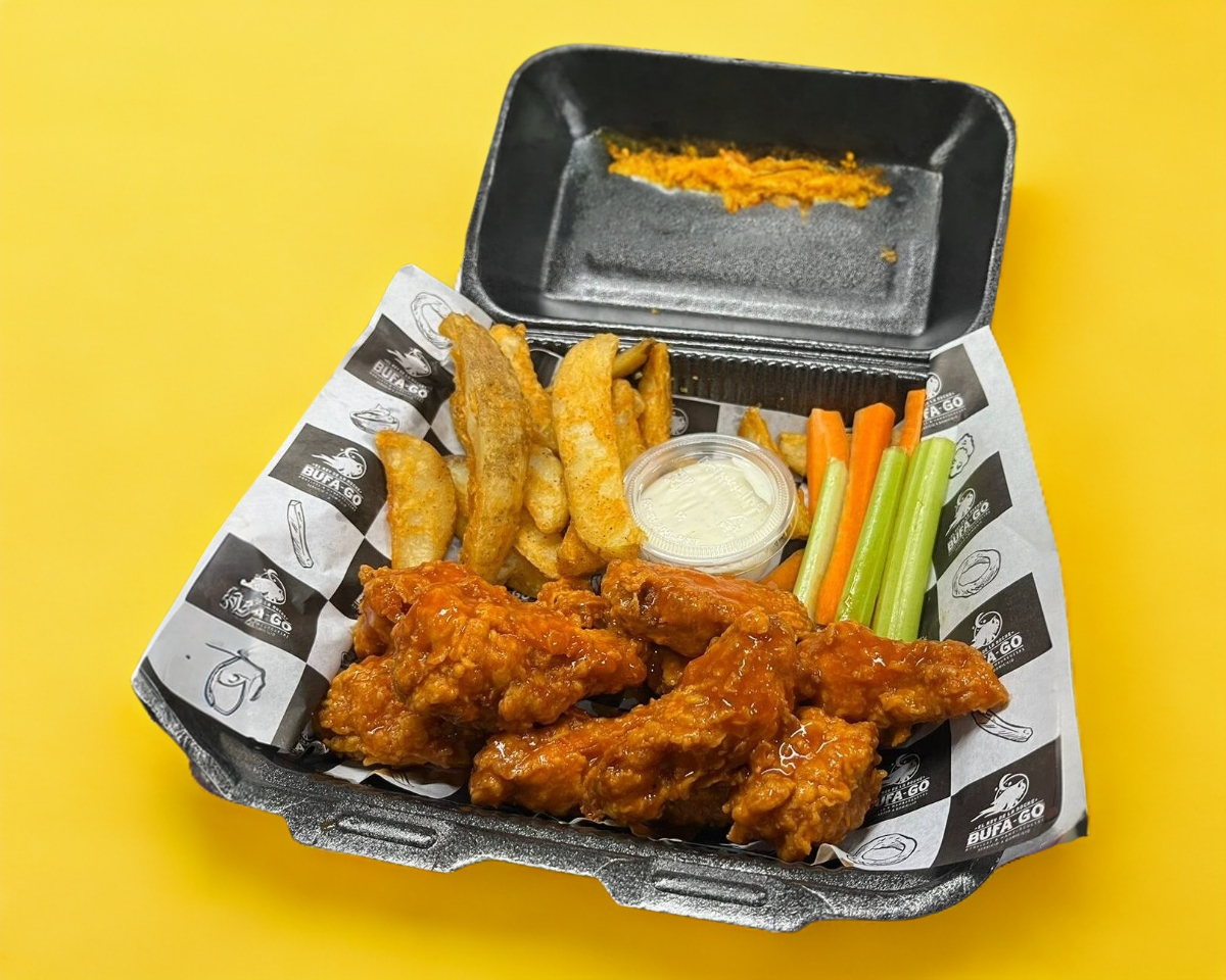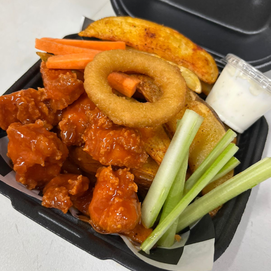 Combo con una pequeña porción de Boneless de 80 gramos , un aro de cebolla , papas ,zanahoria y apio