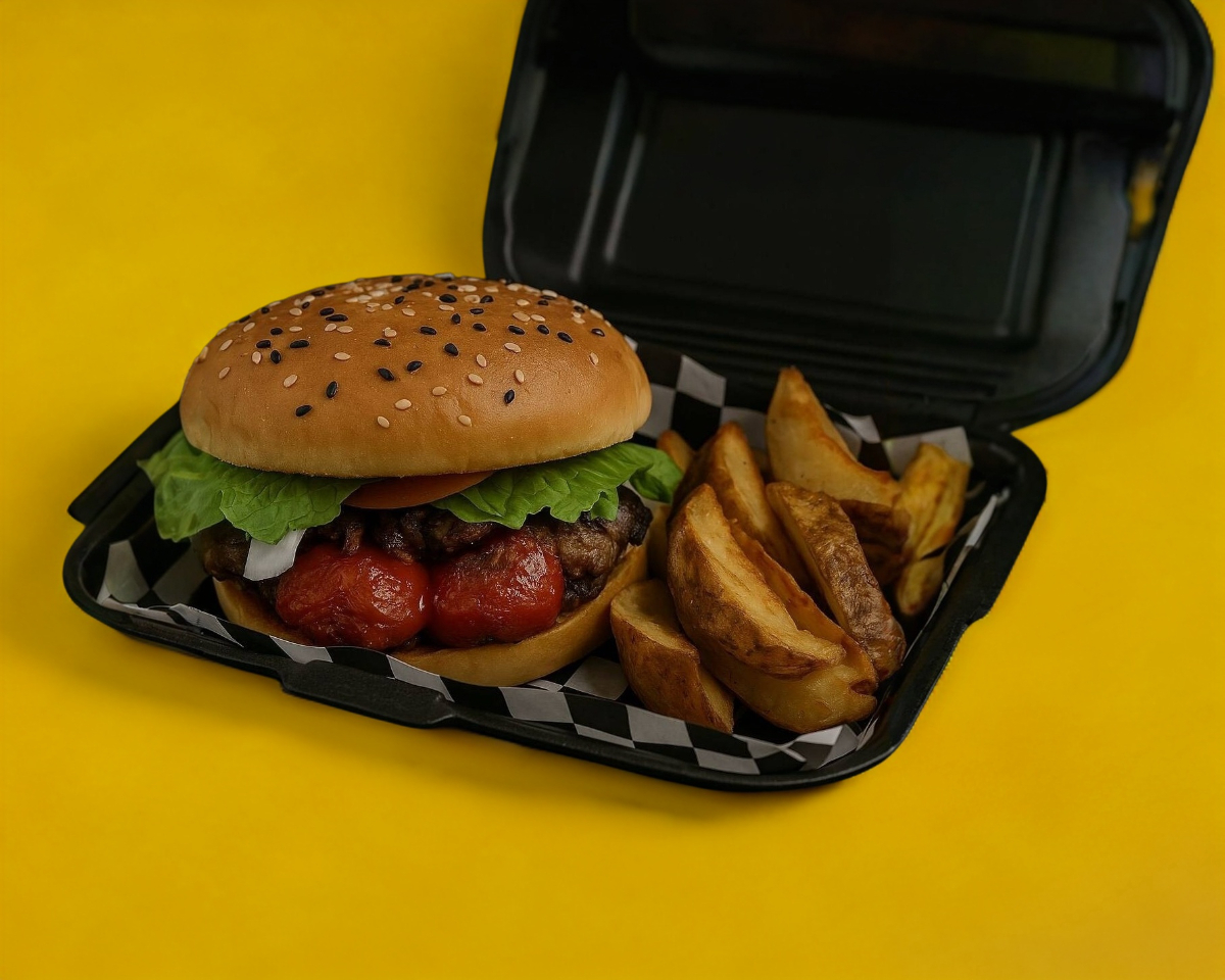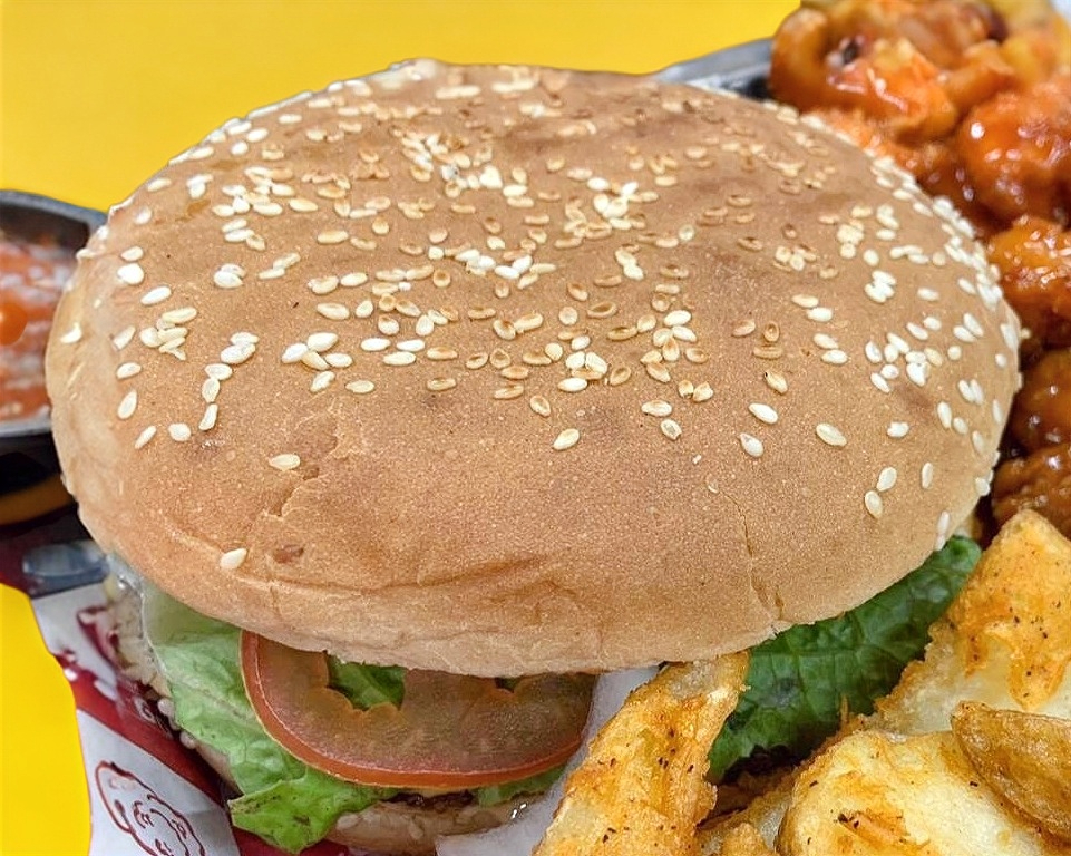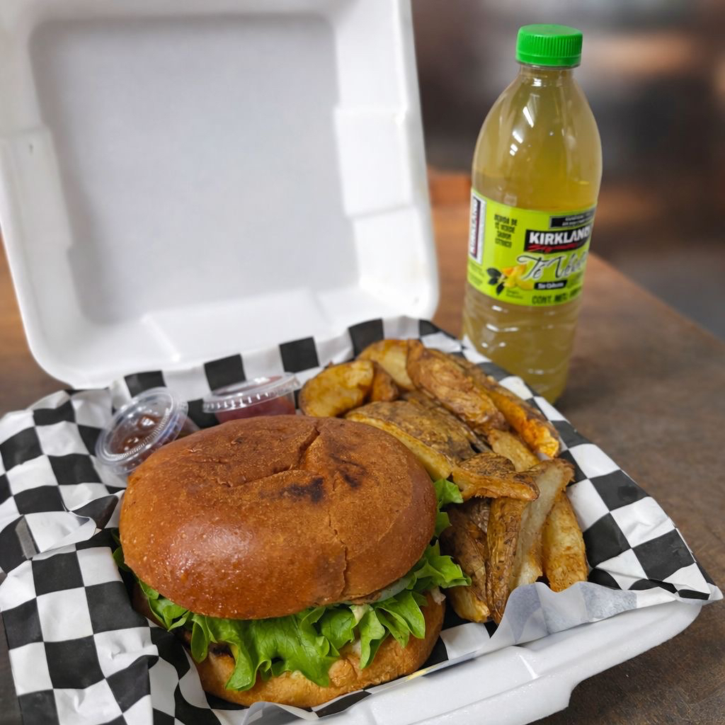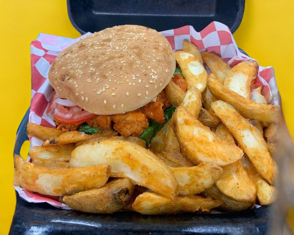 deliciosa hamburguesa de boneless con pan americano,cebolla , tomate ,lechuga acompañada de nuestras papas favoritas de la casa