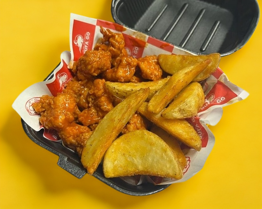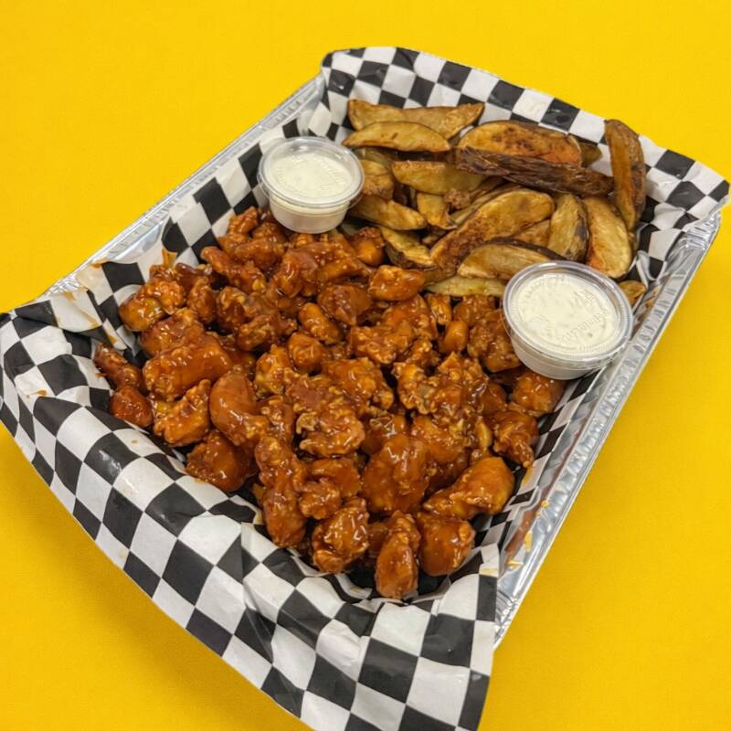 175 gramos de boneless bañados en una sola salsa de tu elección acompañados papas sazonadas y aderezo ranch