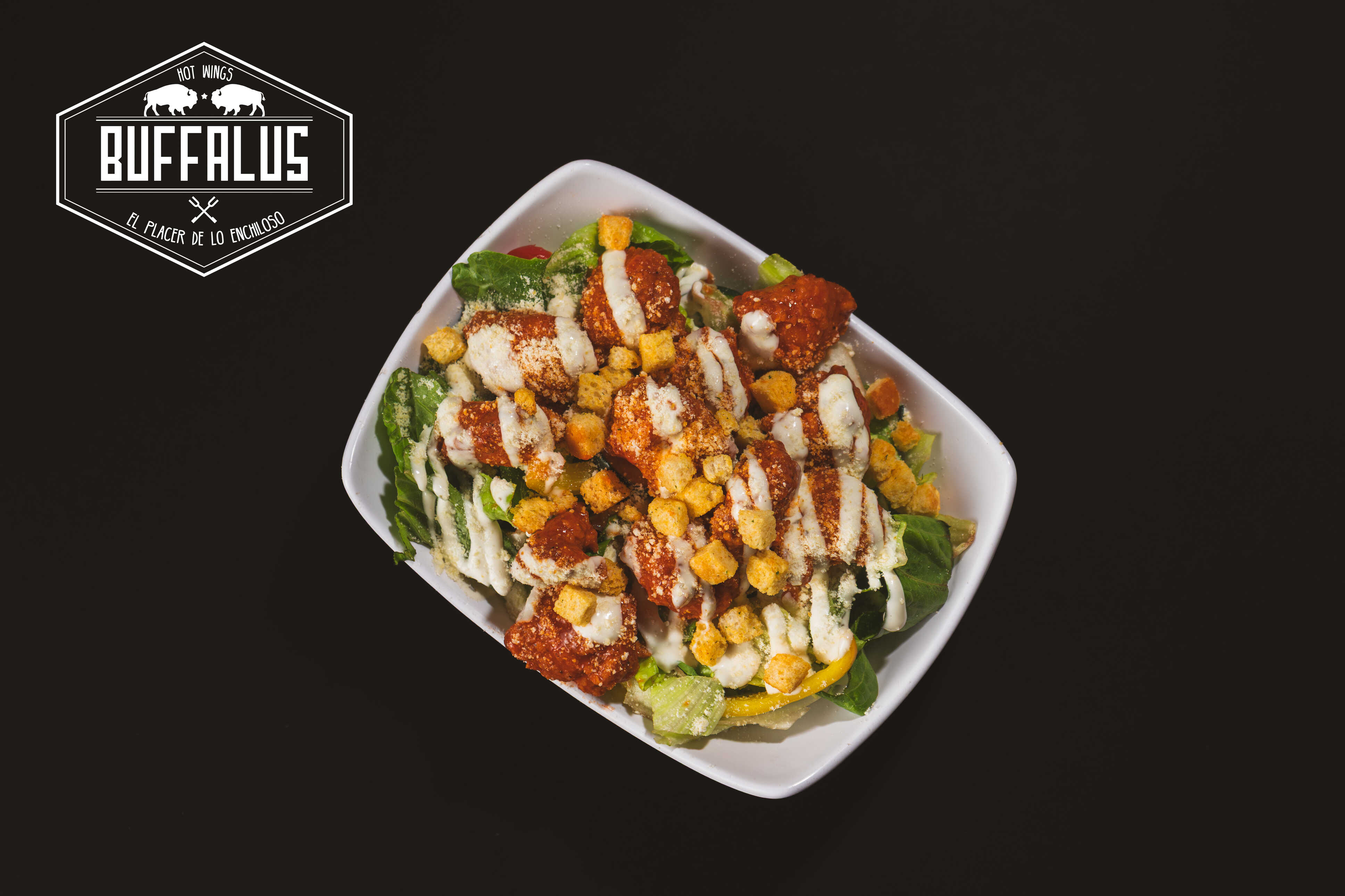 Ensalada de lechugas, espinaca, morrones, pepino, tomate cherry on croutones y aderezo ranch de la casa; coronado con 250 g de boneless en salsa de tu preferencia.
