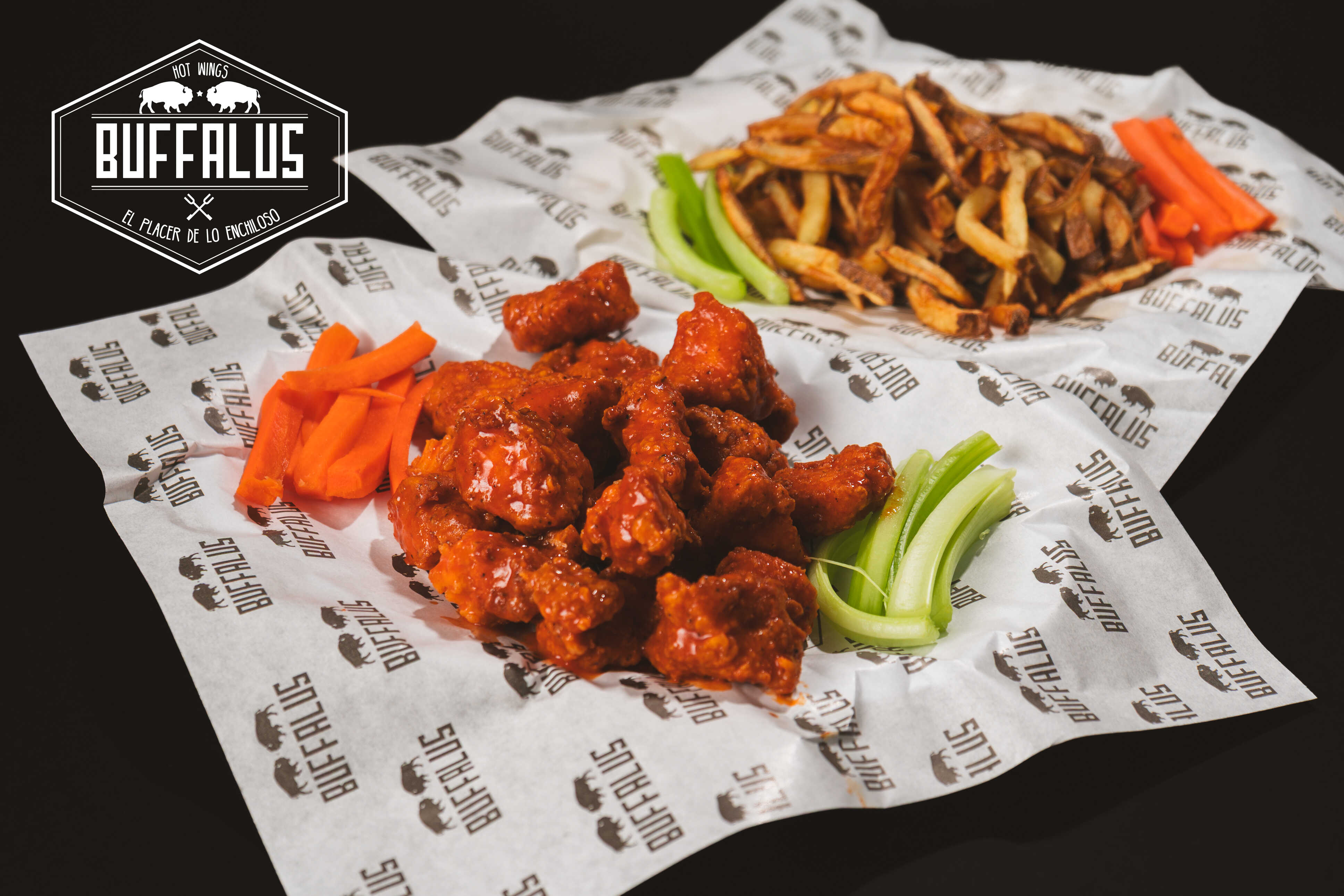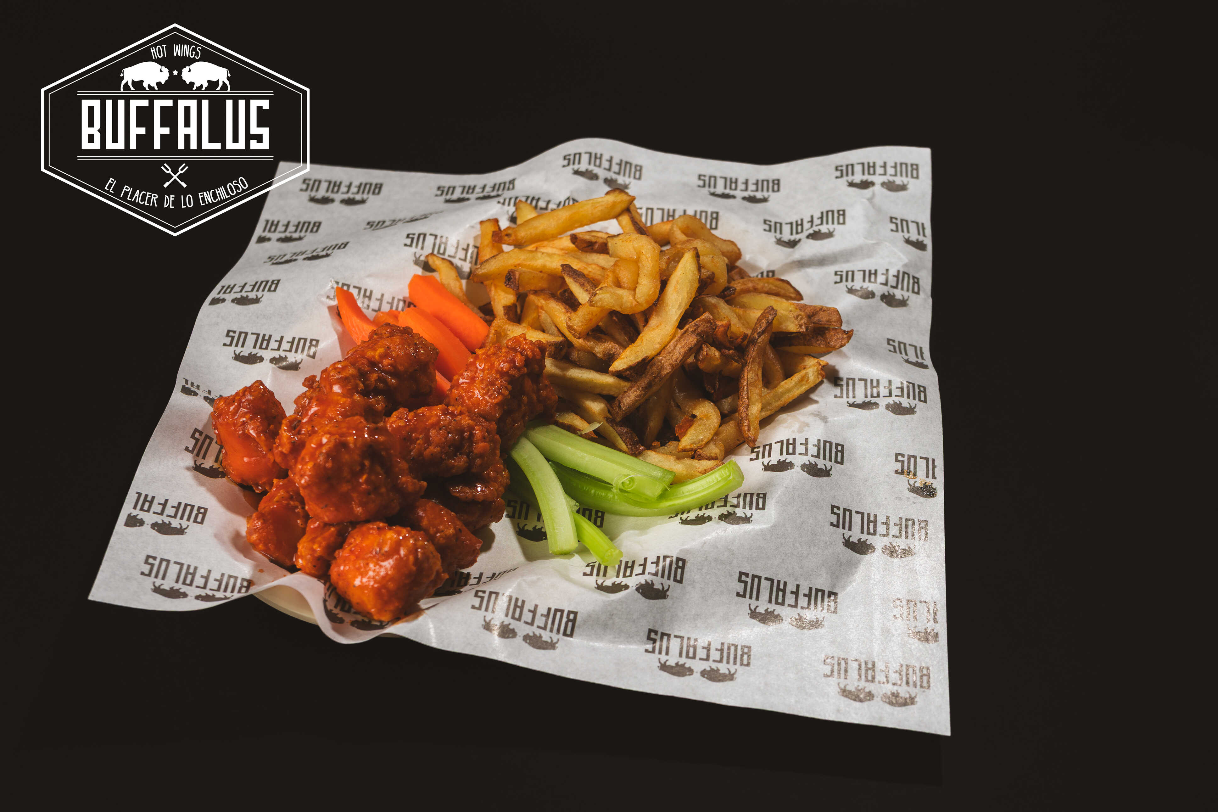 Boneless en salsa de tu preferencia, empanizados de manera abundante en Flaming Hot; acompañado de papas.