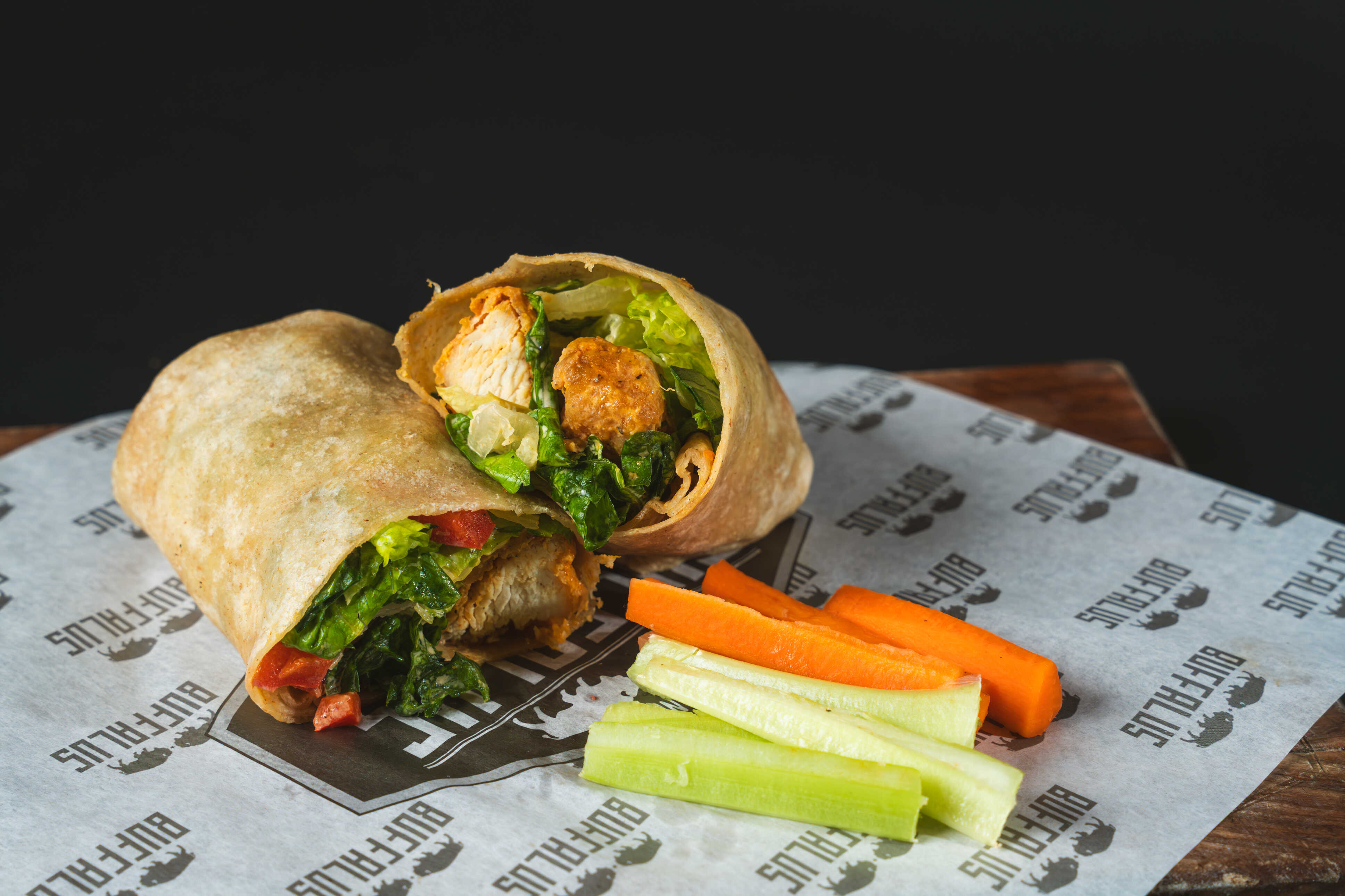Tortilla de chipotle, espinaca o integral con mix de lechuga, pepino, morrones con boneless Búfalo.