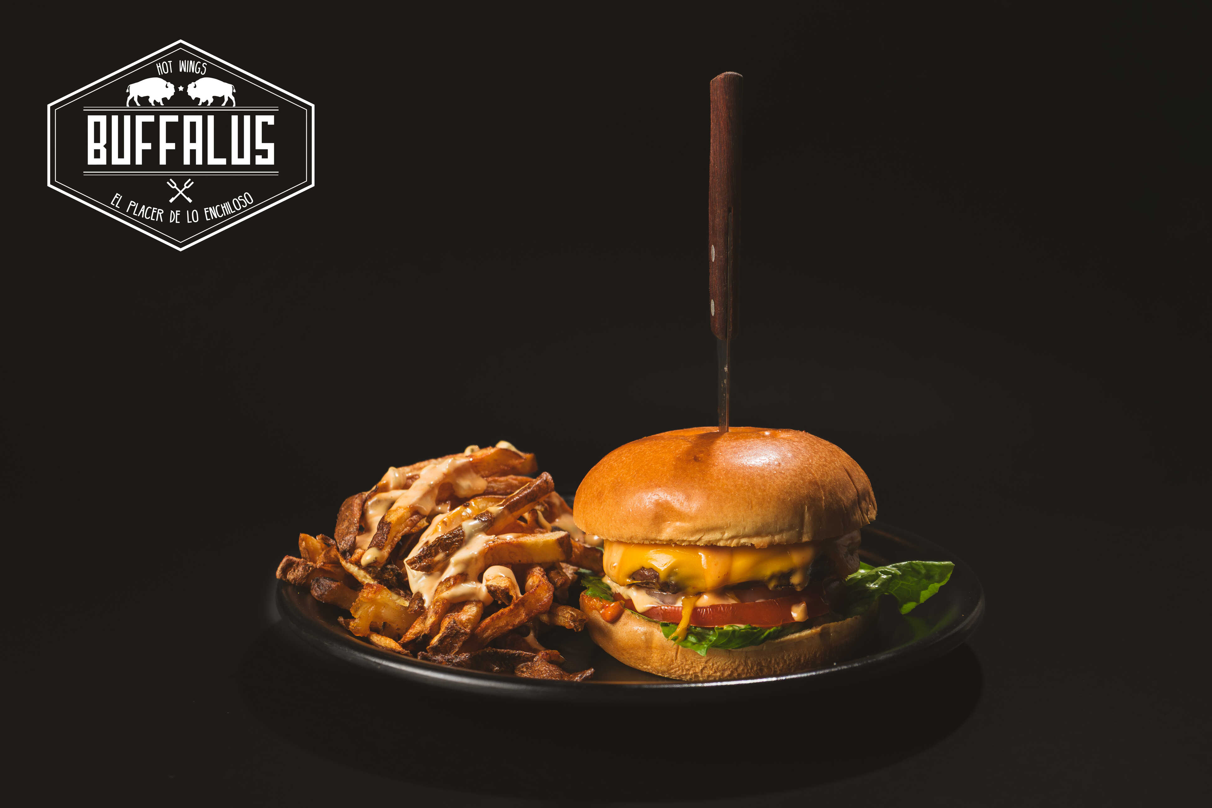 Hamburguesa 100% de res, queso chédar, orden de papas y nuestro aderezo de la casa.