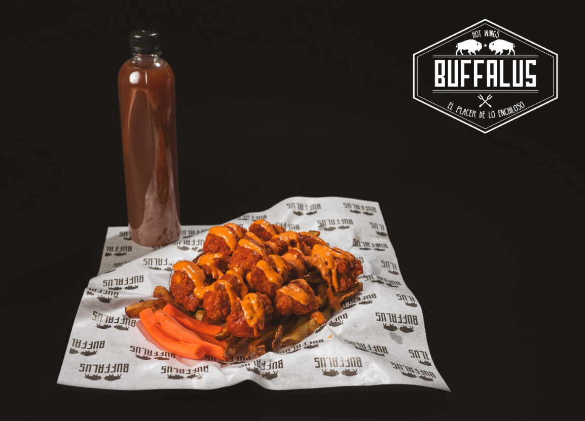 Boneless en salsa de tu preferencia, empanizados de manera abundante en Flaming Hot; acompañado de papas.