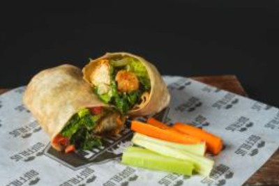 Tortilla de chipotle, espinaca o integral con mix de lechuga, pepino, morrones con boneless Búfalo.