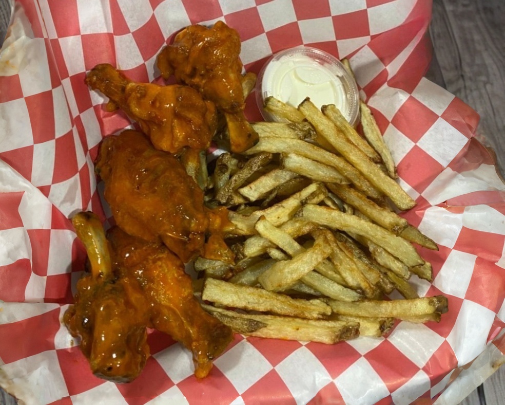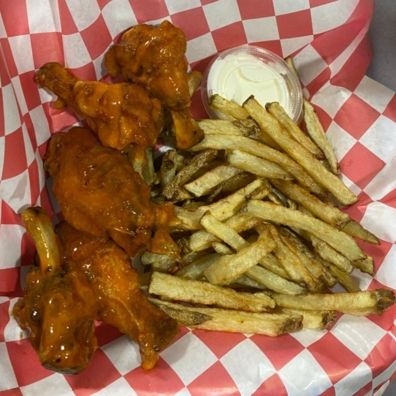 300 g de alitas de pollo, porción de papas fritas, bastones de zanahoria y aderezo.