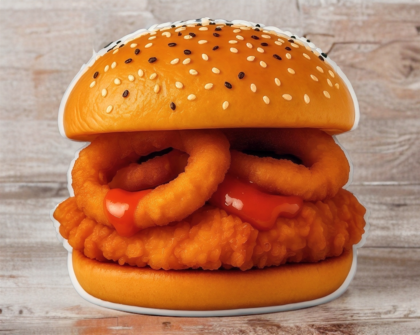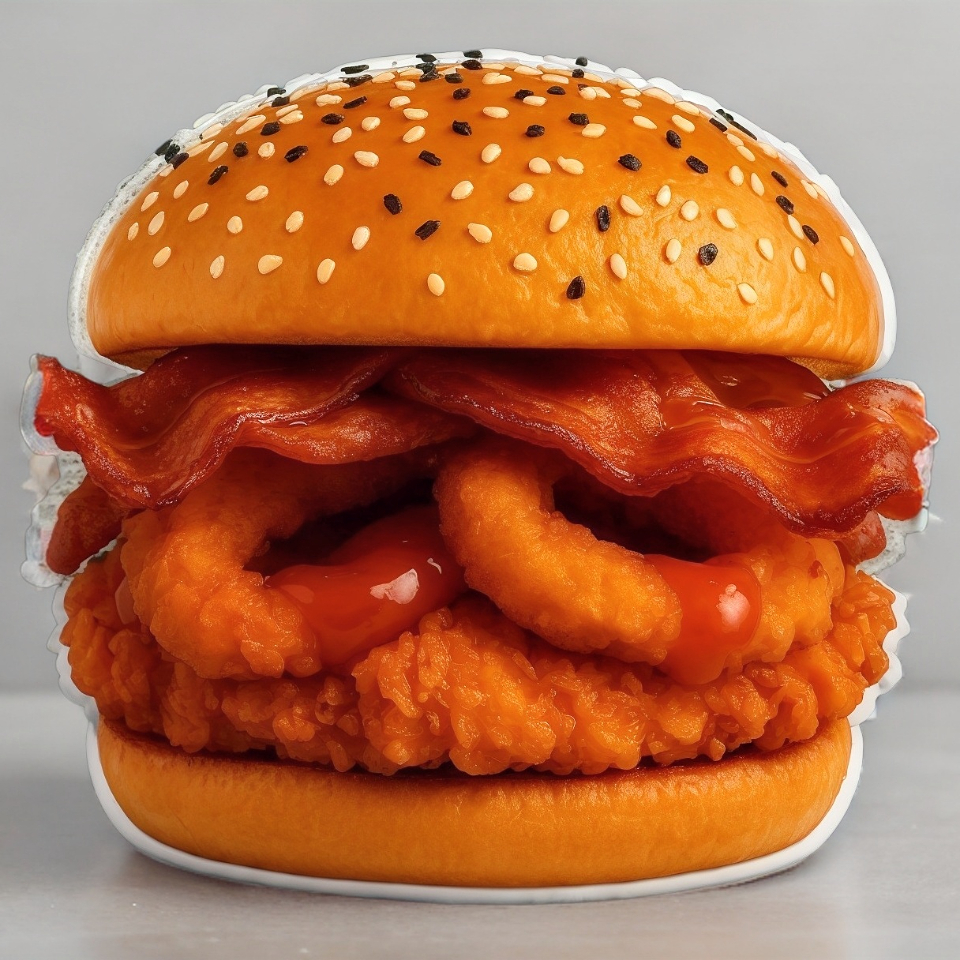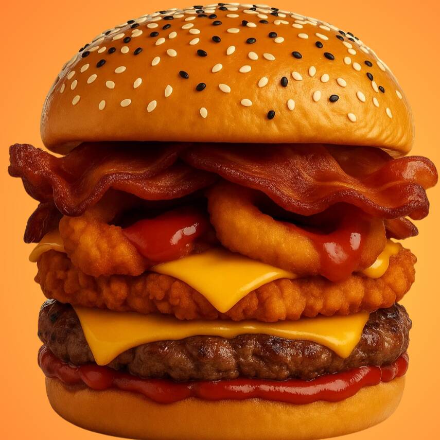 Pechuga de pollo empanizada, carne, doble queso, doble salsa, 4 aros de cebolla, aderezo y porción de tocino