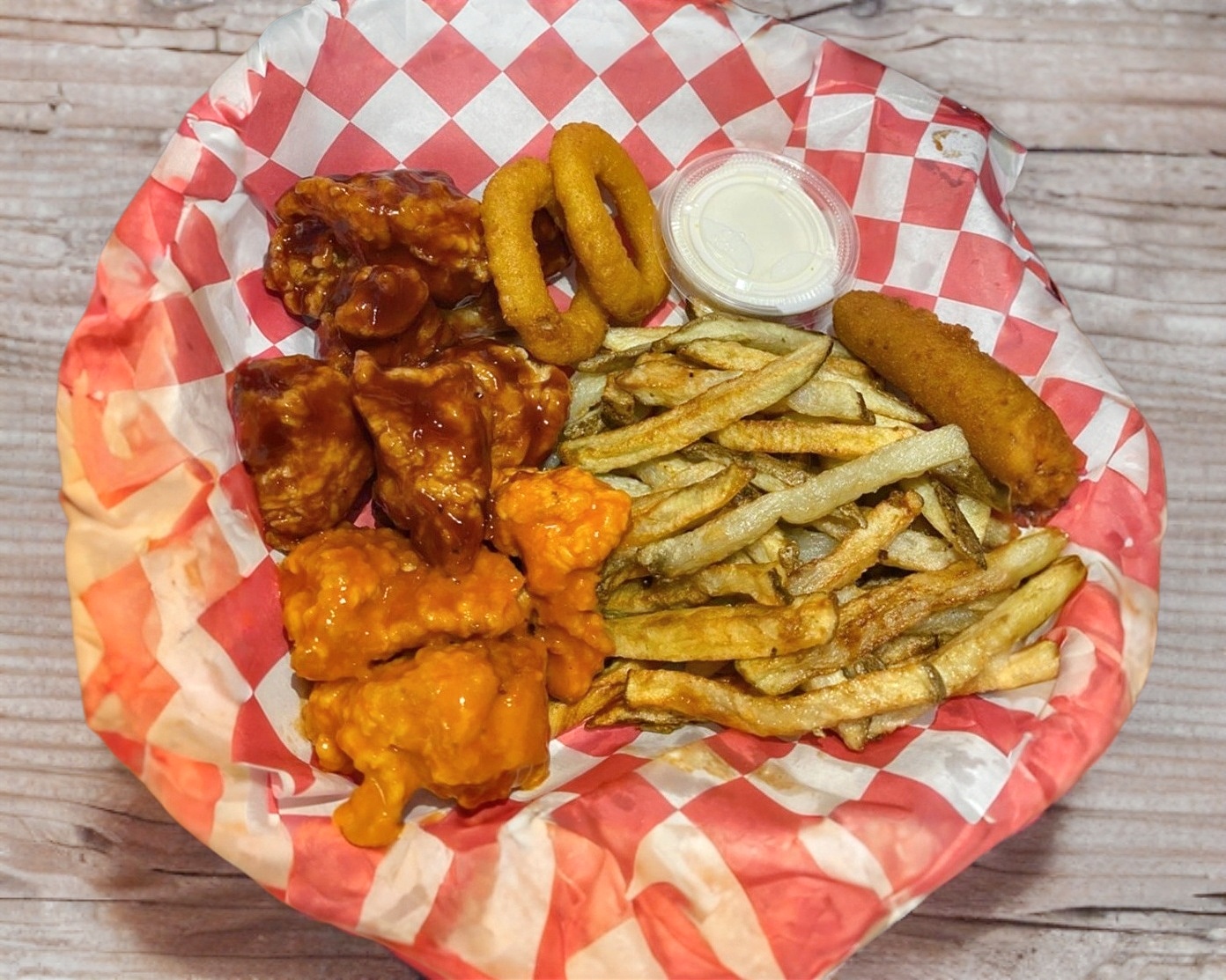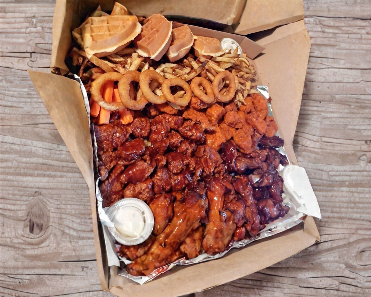 250g boneless, 1/2 kilo alitas, 4 aros de cebolla, 2 dedos de queso, 2 waffles, papas fritas y aderezo