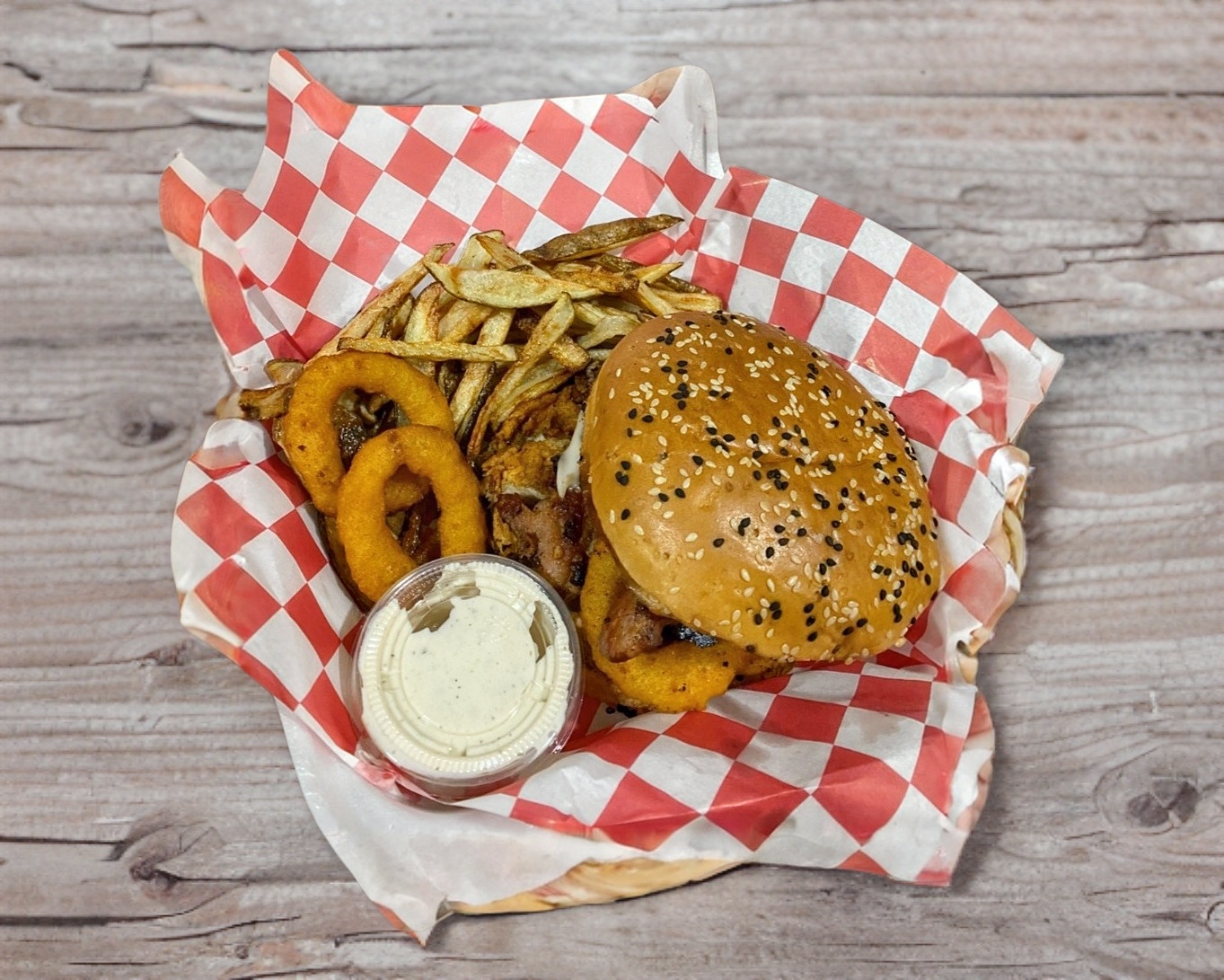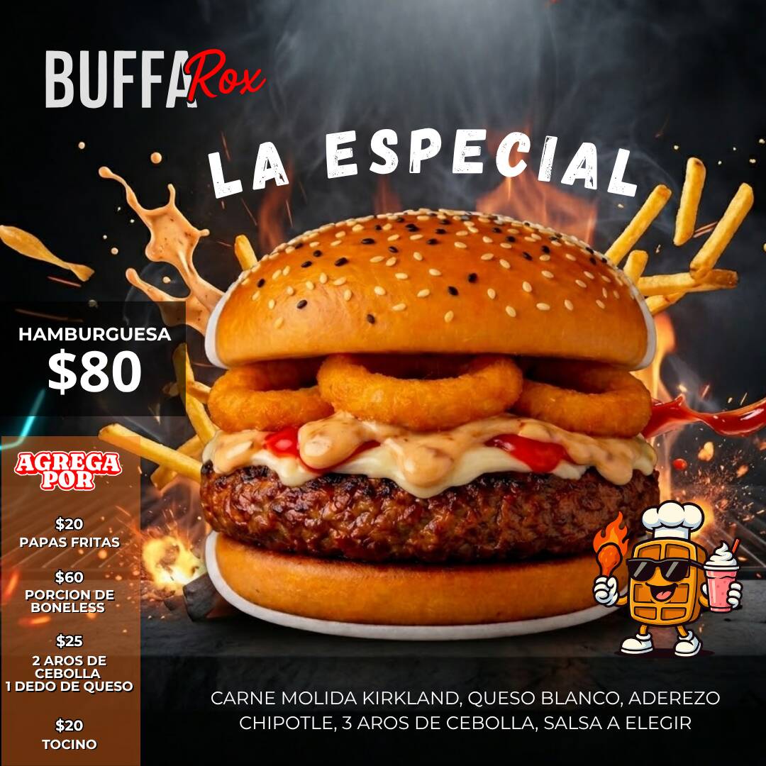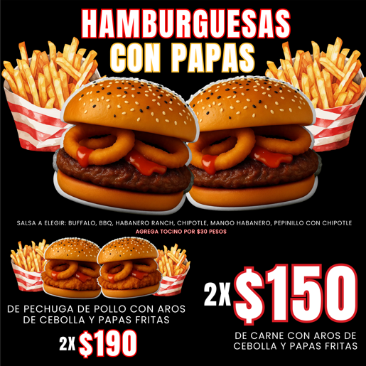 Carne molida, tocino, queso, 2 aros de cebolla, salsa a elegir buffalo, bbq o habanero ranch y aderezo -no lleva verduras