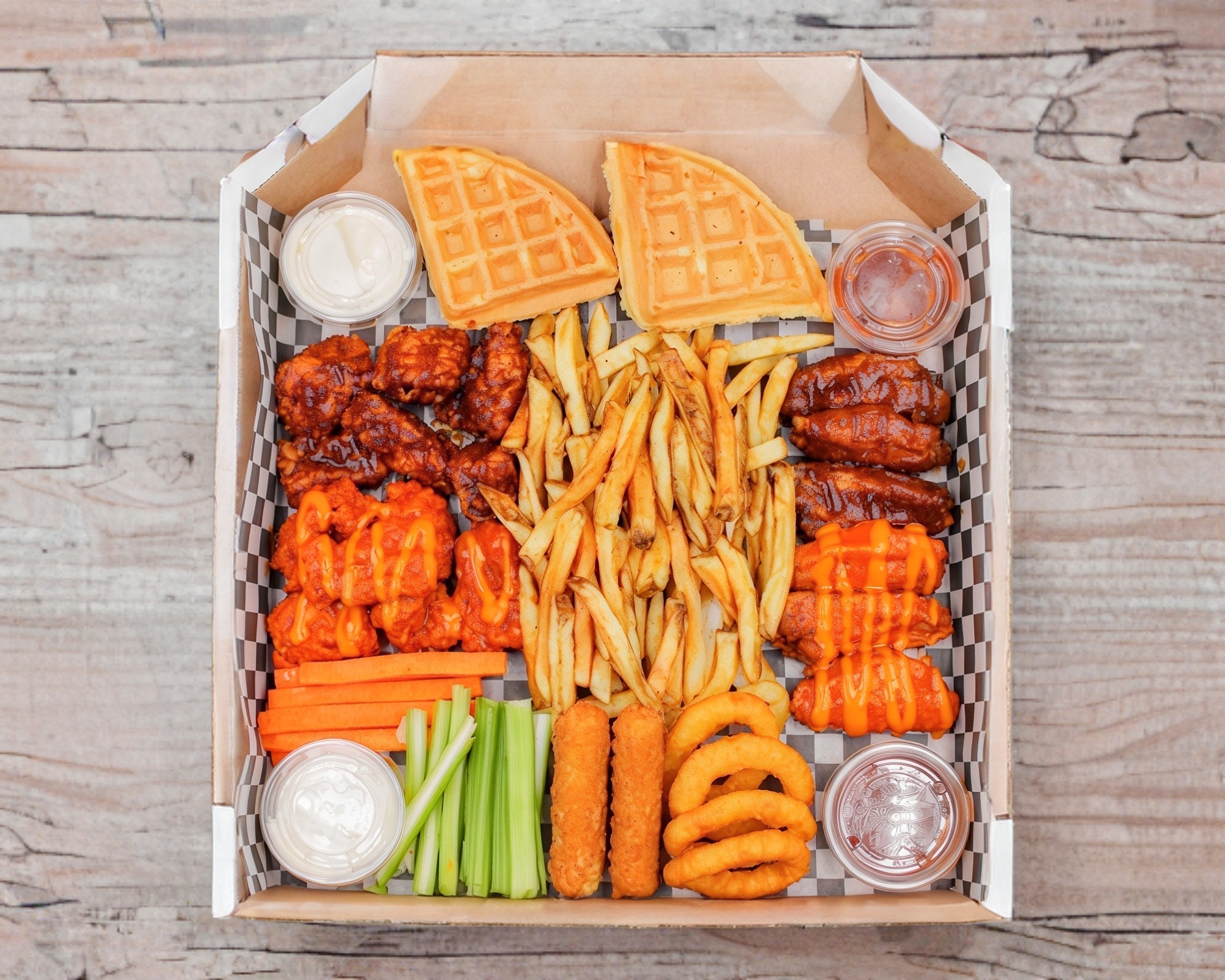 ½ kilo boneless, 1/2 kilo alitas, 6 aros de cebolla, 3 dedos de queso, 3 waffles, papas fritas, zanahoria, apio y aderezo