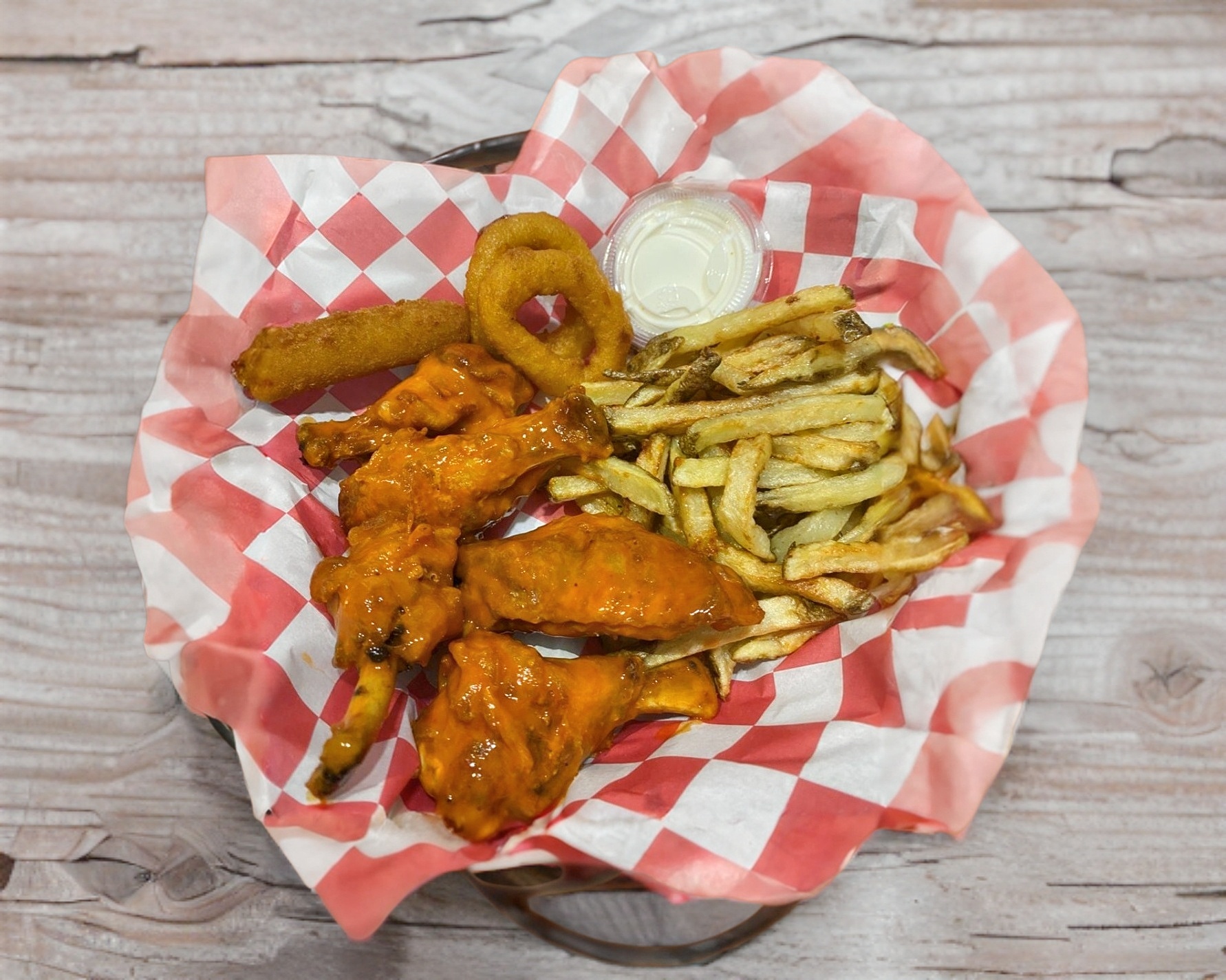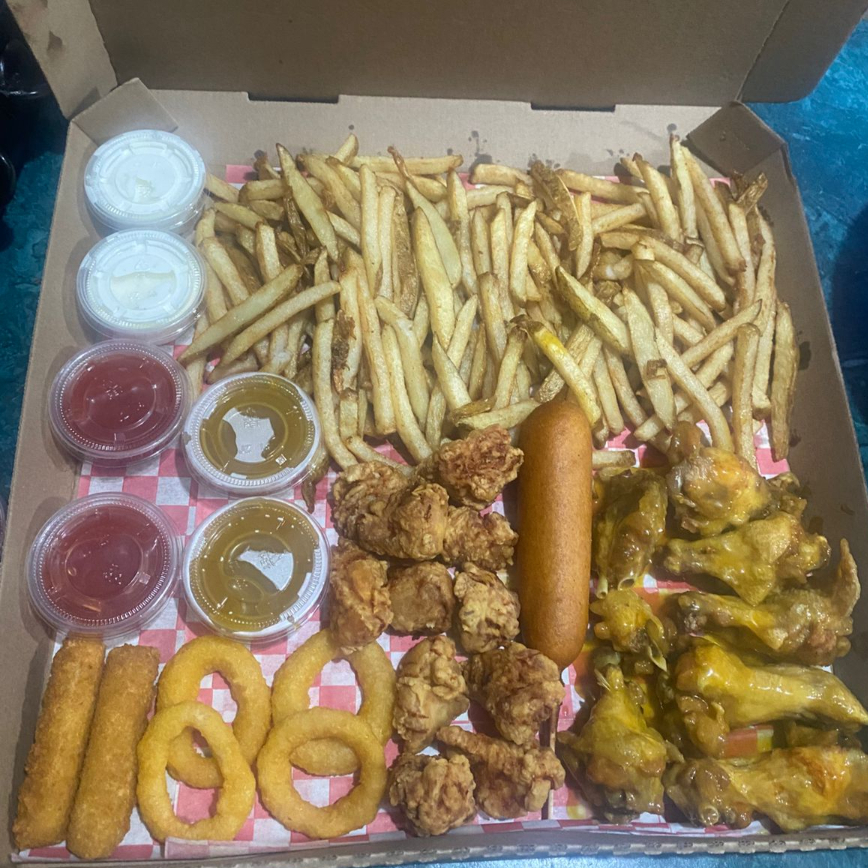 200 g pechuga de pollo empanizada, 200 g de alitas, porción de papas fritas, 2 aros de cebolla, 1 dedo de queso,, bastones de zanahoria y aderezo.