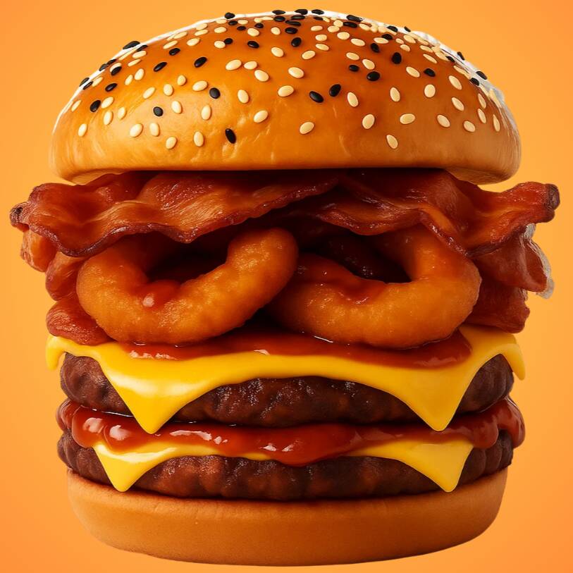 Doble carne, doble queso, doble salsa, 4 aros de cebolla, porción de tocino y aderezo,