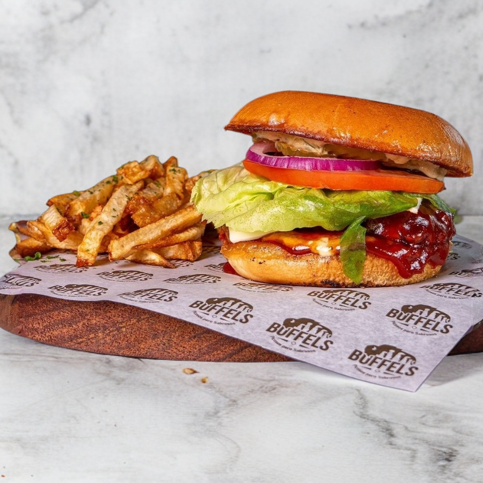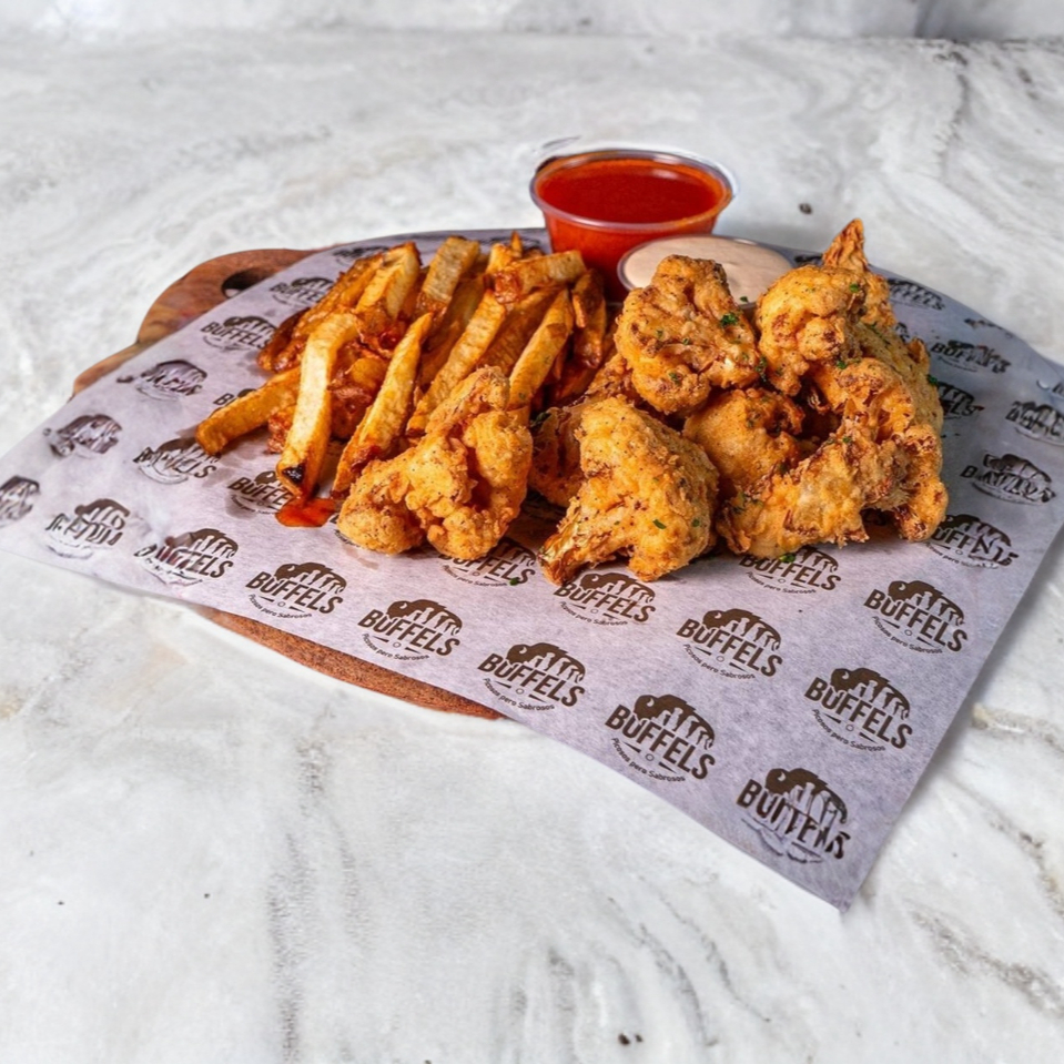 320 Gramos de boneless coliflor, bañados en salsa de tu elección, acompañados de papas fritas.