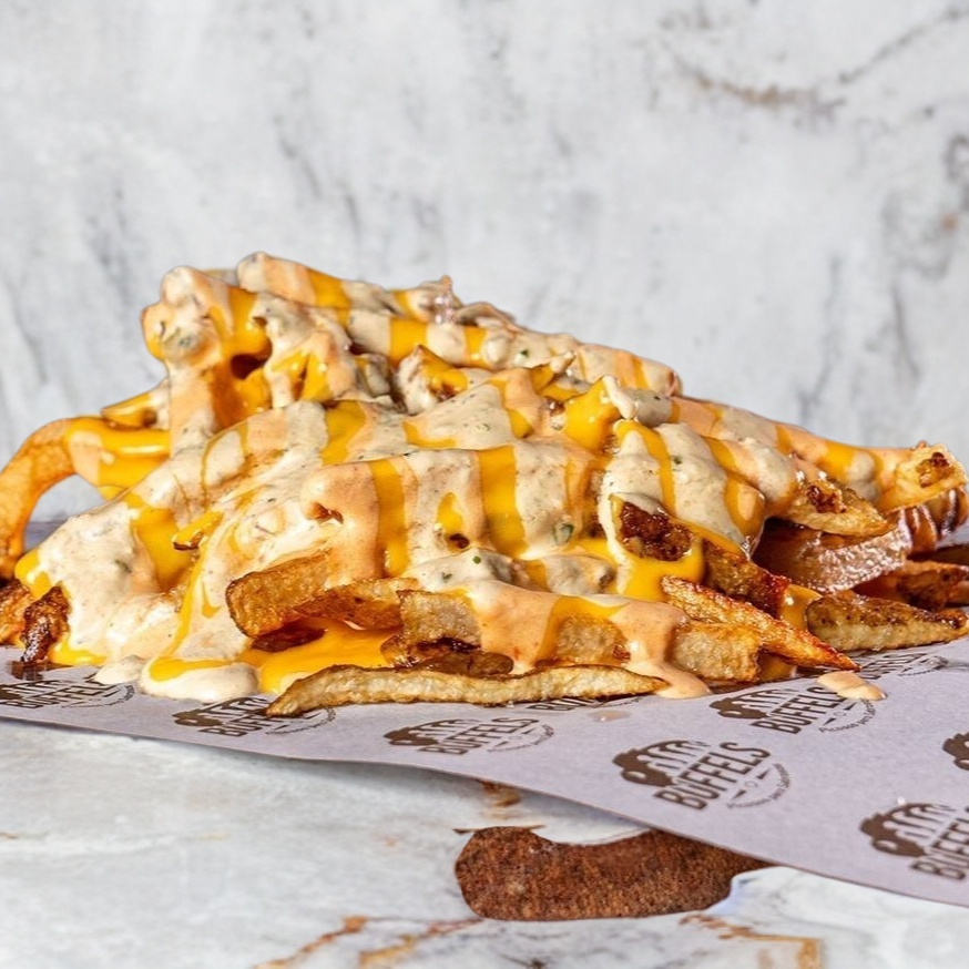 Papas fritas con queso de nachos, crema agria, boneless búfalo, aderezo jalapeño y aderezo chipotle.