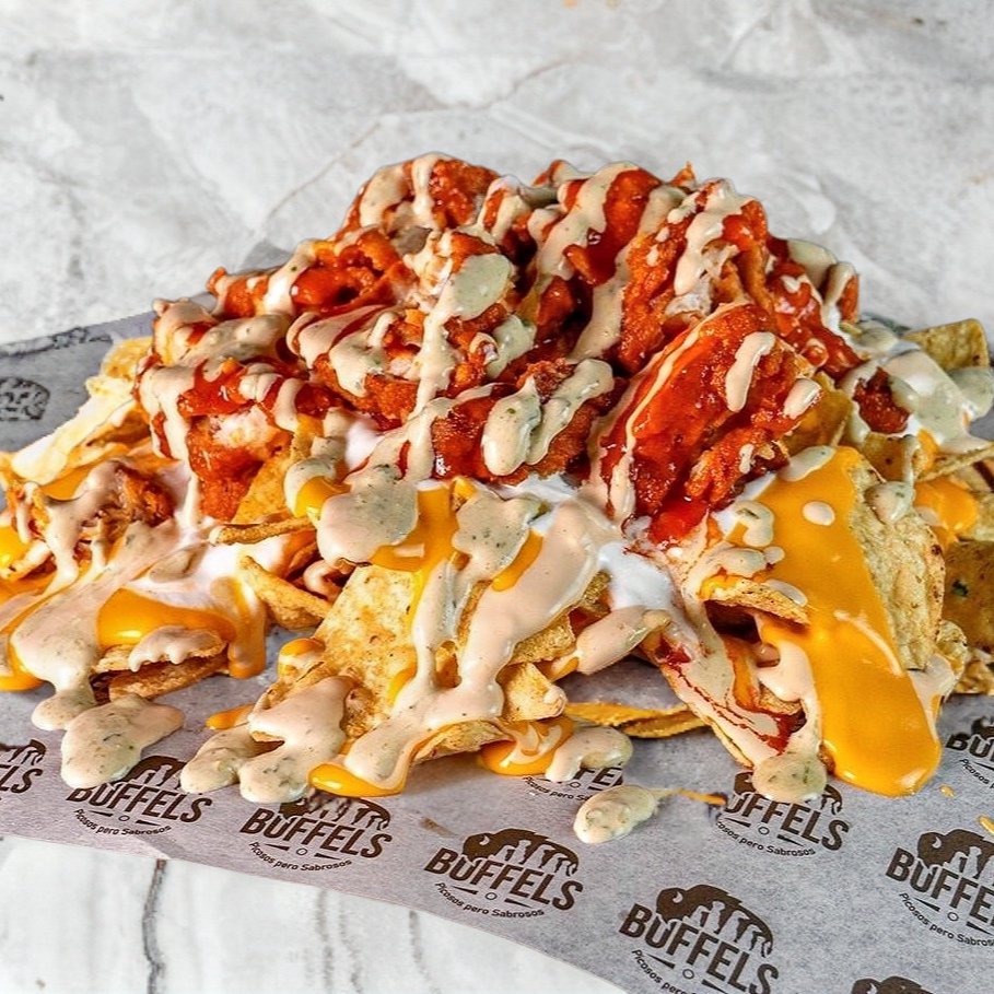 Totopos bañados con queso de nachos, crema agria, boneless búfalo, aderezo jalapeño y aderezo chipotle.