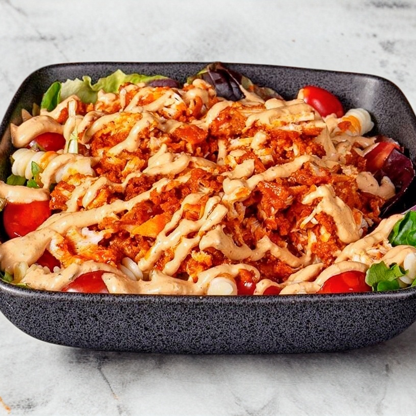 Cama de ensalada mixta con pasta fusilli, cebolla morada, tomate cherry, boneless búffalo y un topping de aderezo favorito.