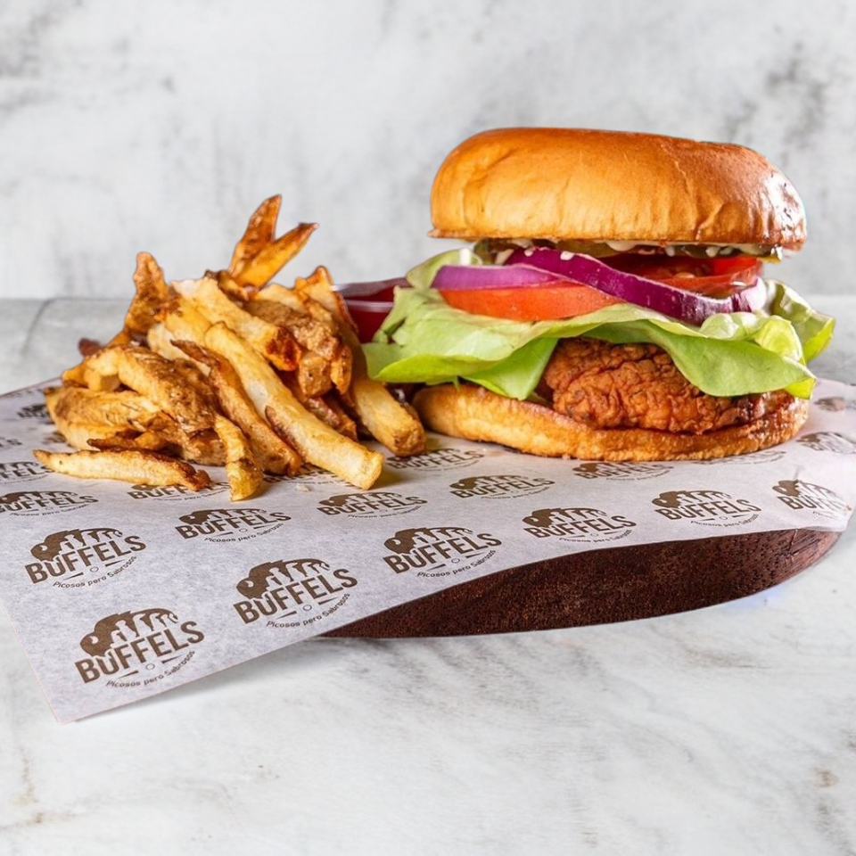 Pechuga de pollo empanizada, bañada en salsa de tu elección con tomate, cebolla, lechuga, pepinillos, queso blanco y aderezo ranch.