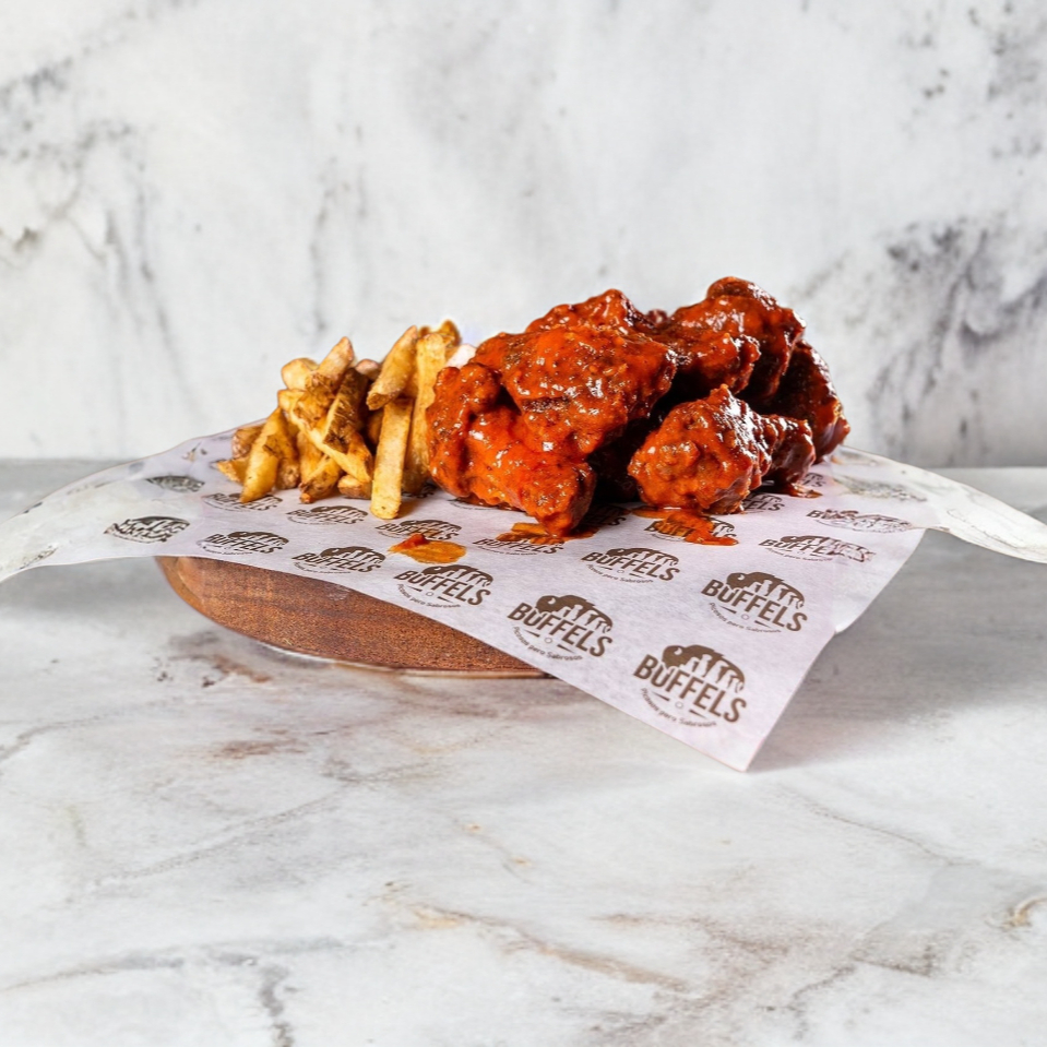 1 Kilo de boneless bañados en salsa de tu elección, acompañados de papas fritas.