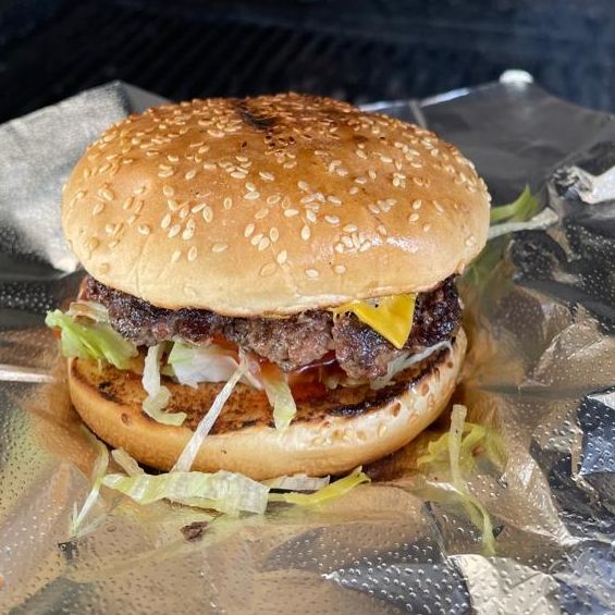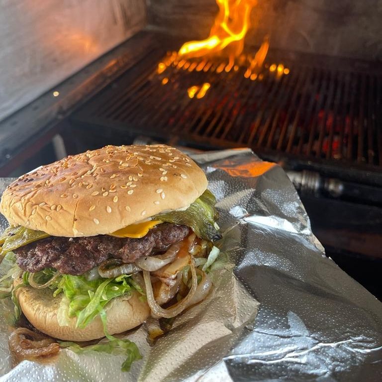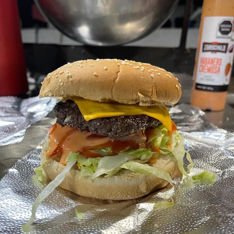 Pan parrillero, carne 100% de res con queso americano, tomate, lechuga, cebolla, catsup, mostaza y aderezo de la casa.