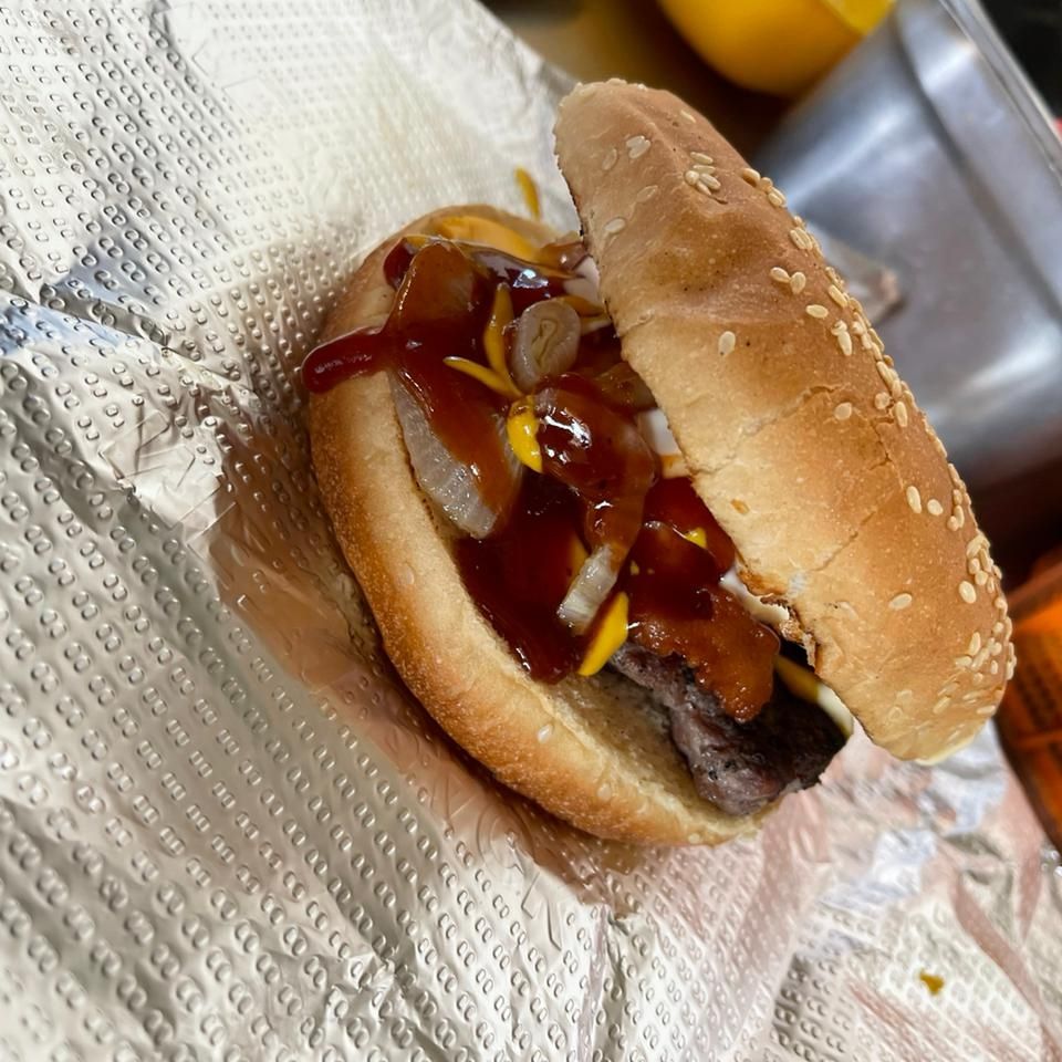 Pan parrillero, carne 100% de res, queso americano, con ricas tiras de tocino ahumado, cebolla caramelizada, mostaza, aderezo de la casa y bañada en rica original salsa BBQ.