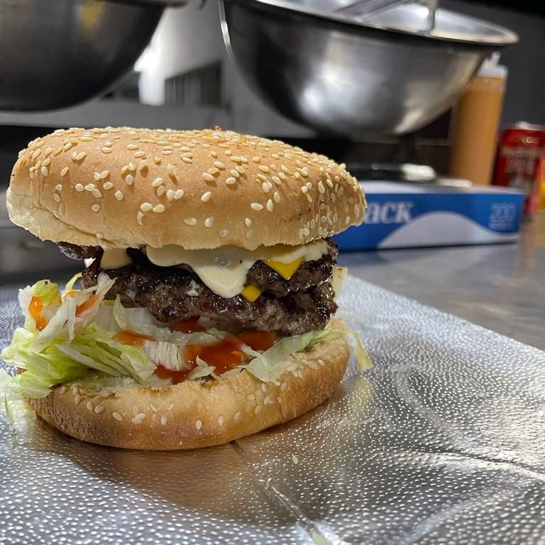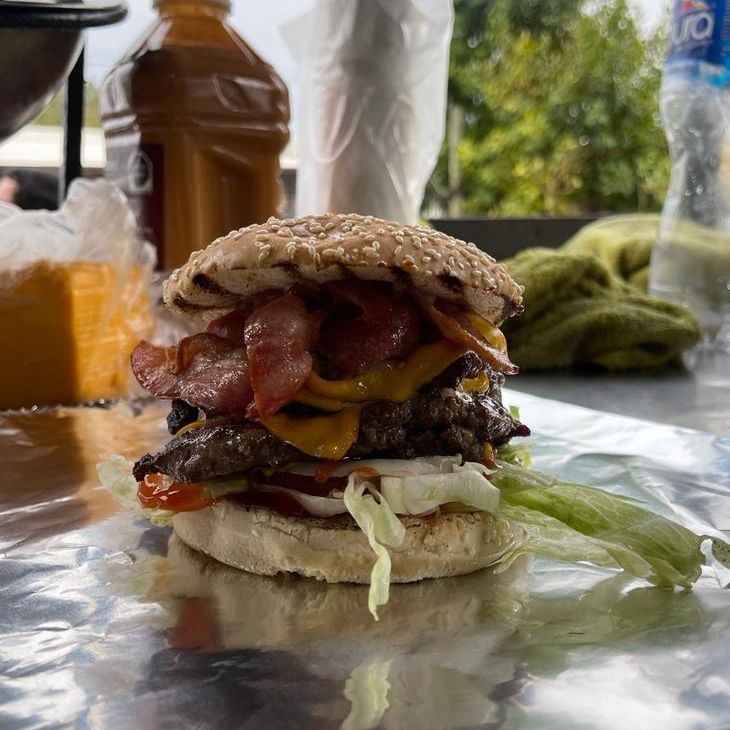 Pan parrillero, carne 100% de res con triple carne y triple queso, tomate, lechuga, cebolla, catsup, mostaza y aderezo de la casa.